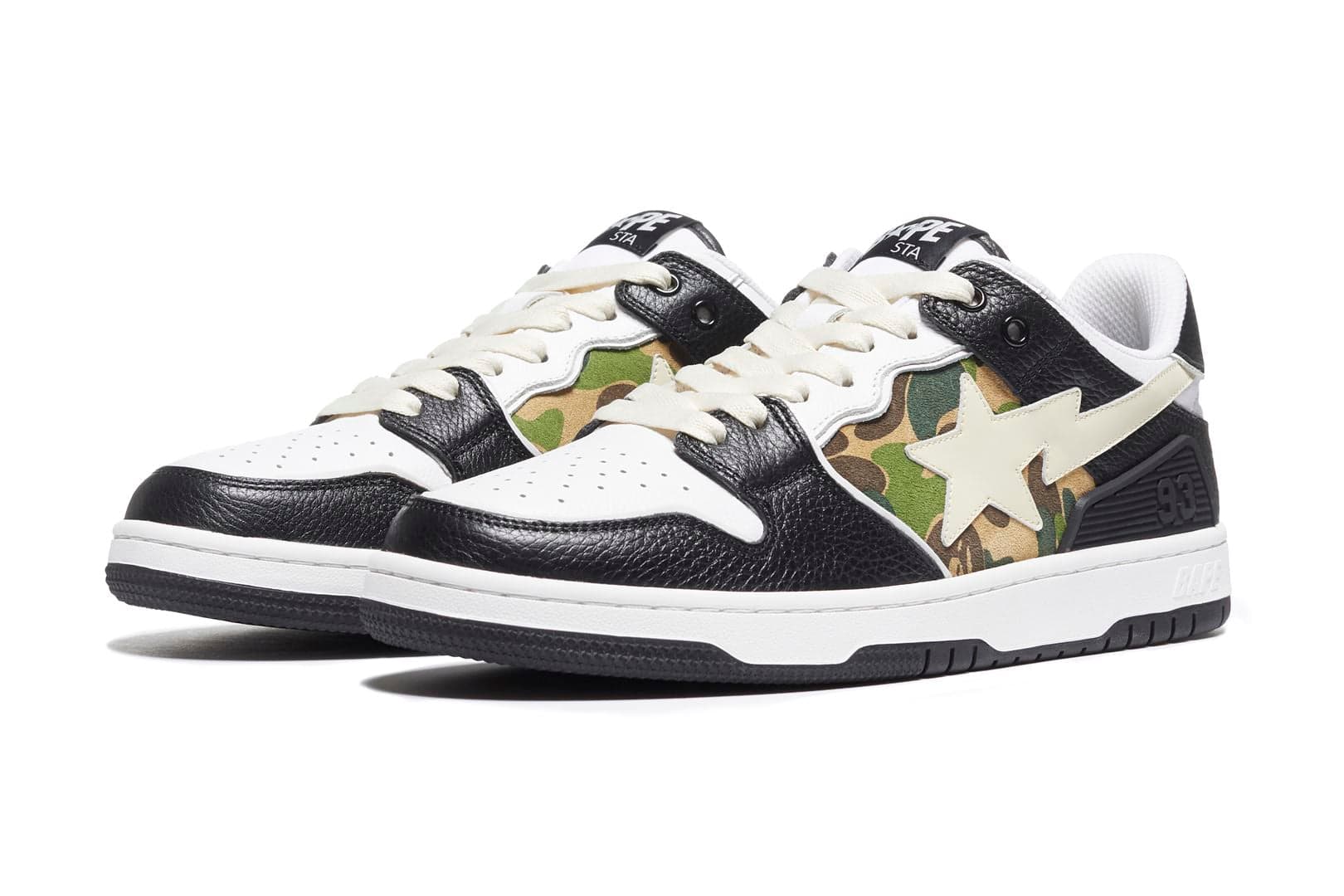 Отличительными элементами модели BAPE Sk8 Sta Black Camo являются фирменный логотип бренда в виде звезды на боковых сторонах и литой пяточный каблук с цифрой 93, обозначающей год основания Bape. Набор кроссовок был представлен тремя вариантами Sk8 Sta Low, включая серо-фиолетовый, черно-желтый и зеленый с красным и фиолетовым. Что касается модели High, то она представлена в простой бело-черной цветовой схеме, а также парусной парой с оранжевыми и красными акцентами.- Артикул: 1H20191033