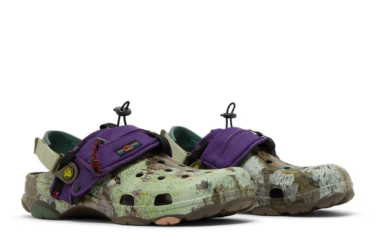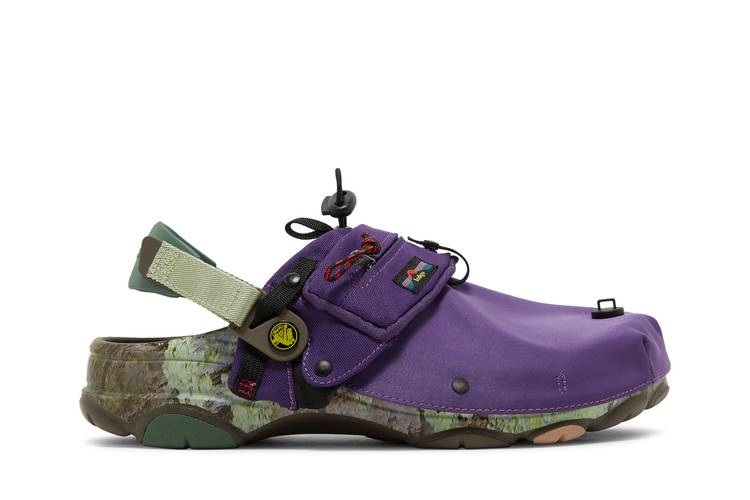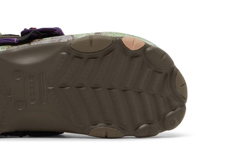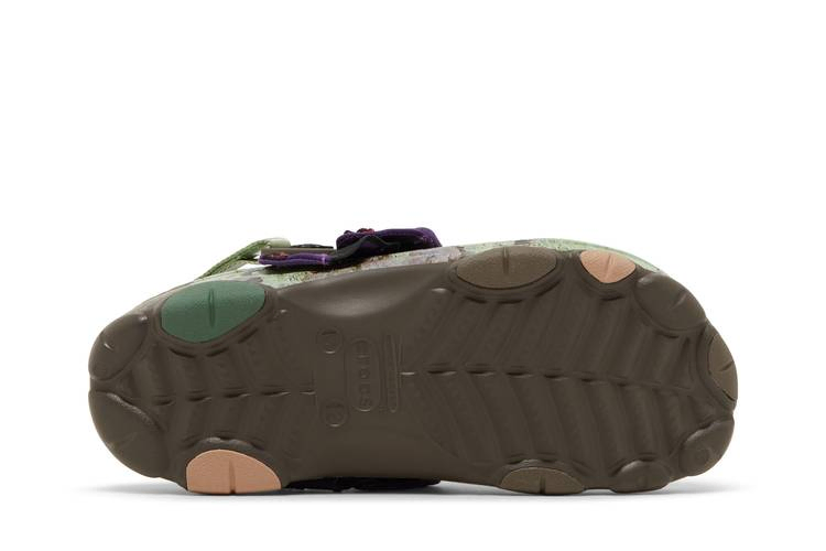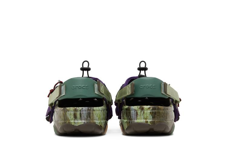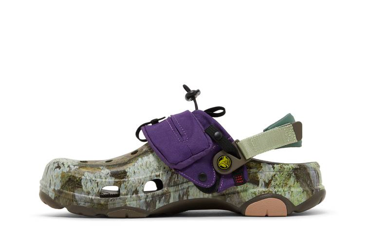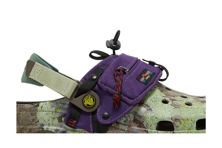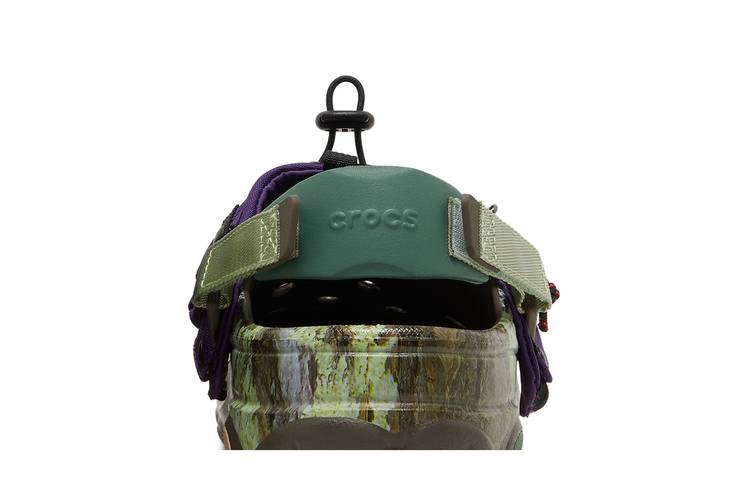Модель Bodega x Crocs Classic All-Terrain Clog 'NICT-TECH', созданная в сотрудничестве с бостонским ритейлером, представляет собой утилитарную обувь, предназначенную для борьбы со стихией. Клоги оснащены регулируемым ремешком на липучке и украшены принтом, вдохновленным мхом и корой деревьев. Зеленые и коричневые тона контрастируют с убирающимся капюшоном из фиолетового нейлона, который фиксируется с помощью застежки и обеспечивает защиту от непогоды и мусора. Подошва с шипами обеспечивает надежное сцепление с поверхностью.- Артикул: 208720 200