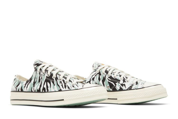 Модель Carhartt WIP x Converse Chuck 70 Low 'Hinterland' демонстрирует принт, представленный в коллекции весна-лето 2021 года. Лиственный дизайн в черном и базиликовом цветах украшает верхнюю часть из 12-каучукового холста с хромированными люверсами и усиленной резиновой крышкой носка. Внешний брендинг ограничен язычком Carhartt и номерным знаком Converse All Star на задней части белой резиновой подошвы. Под ногами резиновая подошва цвета базилика со стандартным для Чака ромбовидным рисунком сцепления.