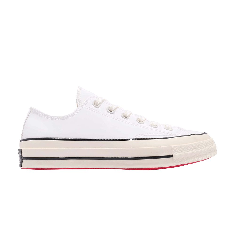 В модели "White Patent" от Converse Chuck 70 Ox, выполненной в монохроматическом стиле, классический низкий силуэт окрашен в белый глянцевый цвет. Модель изготовлена из гладкой искусственной кожи с логотипом All-Star на пятке. Резиновый мысок на полностью красной резиновой подошве с контрастной лисьей отделкой дополняет этот дизайн.