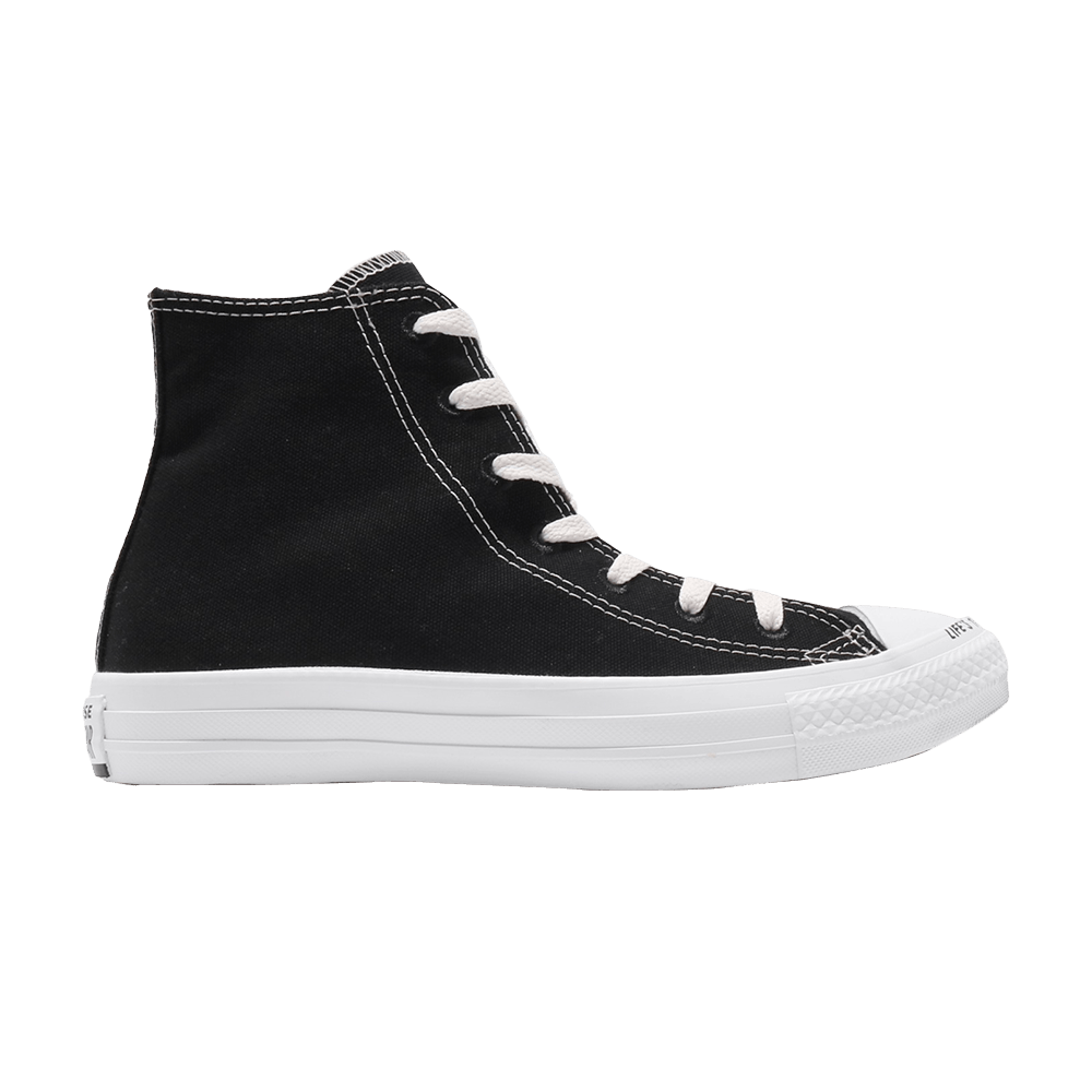 Converse выпустил свою первую модель в 1917 году, которая стала одним из самых узнаваемых силуэтов в истории. Обновленные в июле 2019 года Chuck Taylor All Star Hi из переработанного пластикового холста "Black", изготовленного из вторично использованных пластиковых бутылок, выполнены в стиле "инь и янь" с контрастной белой строчкой и традиционными хлопковыми шнурками того же оттенка. Вулканизированная резиновая подошва заменяет типичную черную полосу на белую и имеет девиз "Жизнь слишком коротка, чтобы тратить ее впустую" на носке, напоминающий о том, что нужно тратить меньше, а делать больше.