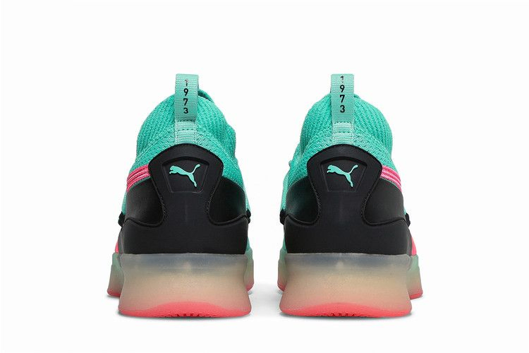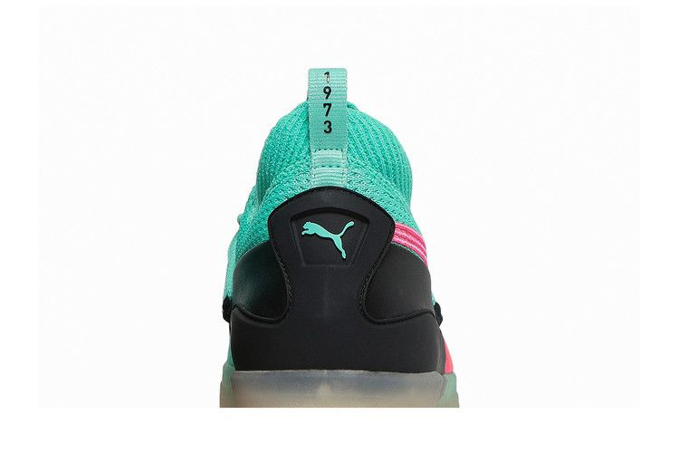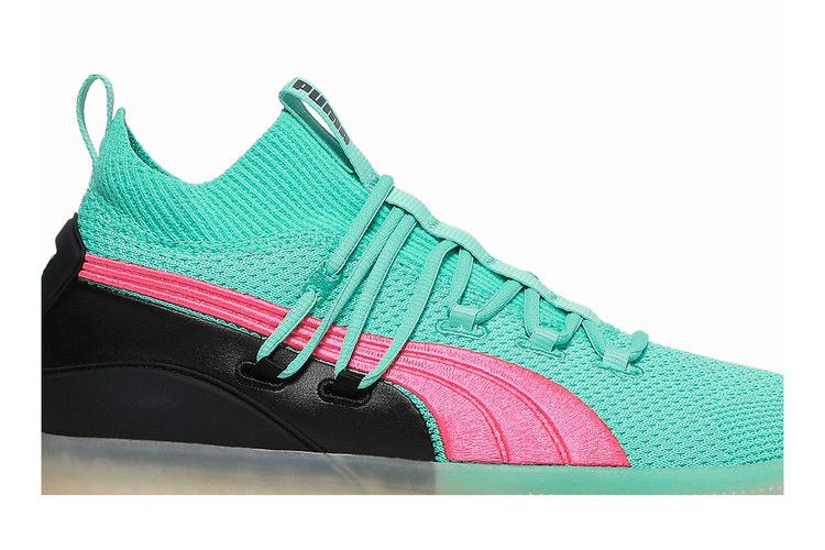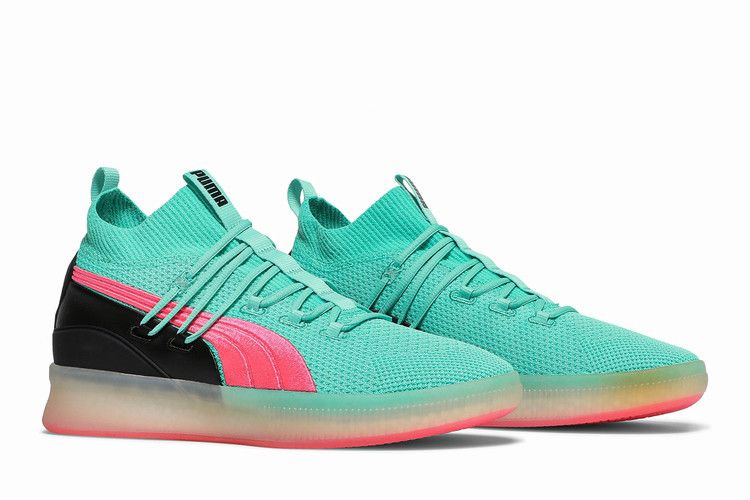 Модель Clyde Court от Puma опирается на наследие легендарной баскетбольной модели, модернизируя ее с помощью таких компонентов, как гибридная система амортизации, сочетающая технологии IGNITE и NRGY. Верхняя часть кроссовок выполнена в ярких оттенках тила и розового цвета на трикотажной конструкции и полосках формы, а черная стойка пятки контрастирует с ними.
