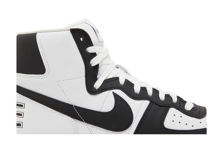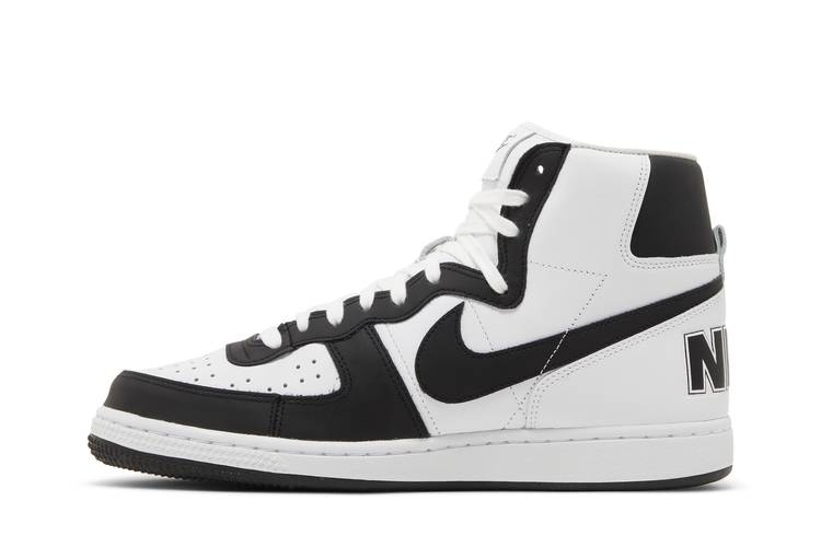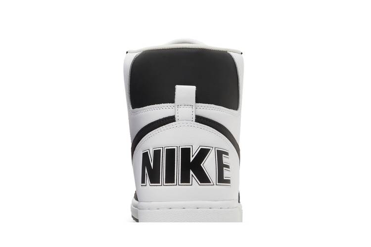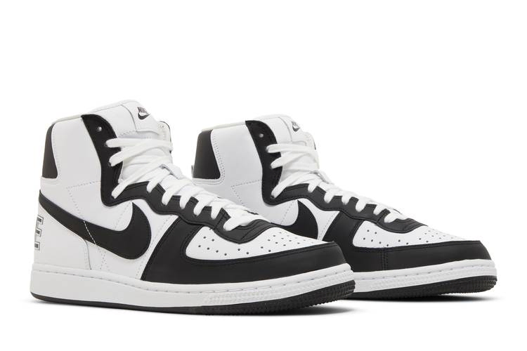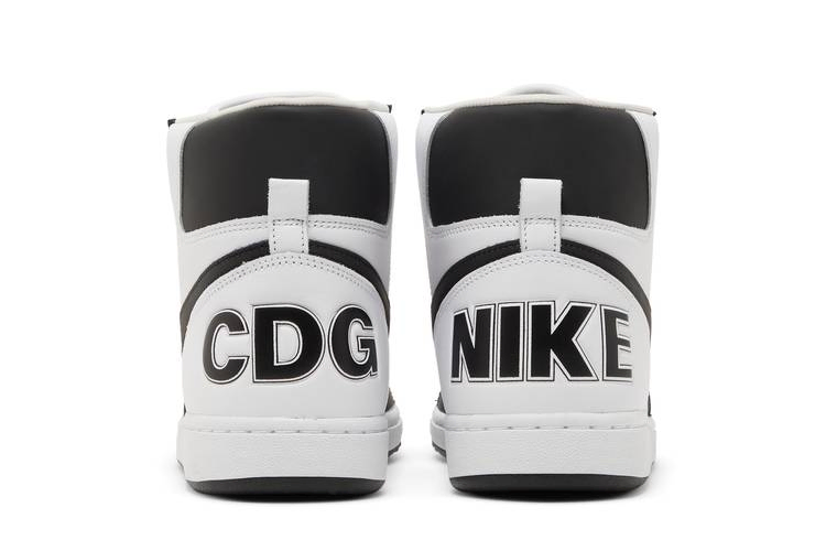 Модель Comme des Garçons Homme Plus x Nike Terminator High 'Black' взята из пакета из трех предметов, состоящего из основных двухцветных вариантов винтажных кроссовок 80-х годов. Эта пара имеет полностью кожаный верх, который сочетает в себе четкую белую основу с контрастными черными акцентами на передней части стопы, заднем язычке и фирменном логотипе Swoosh. Непохожие друг на друга брендинги украшают каждую пятку: на правой - надпись Nike, на левой - "CDG". Кроссовки опираются на традиционную подошву, подчеркнутую белыми боковинами и черной резиновой подошвой.
