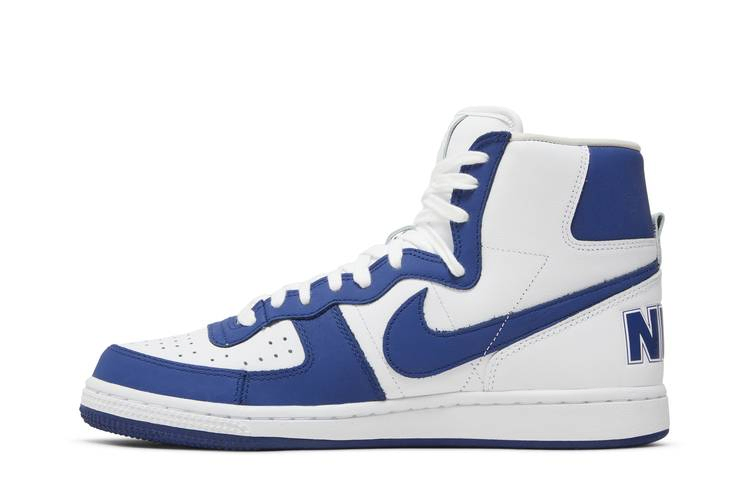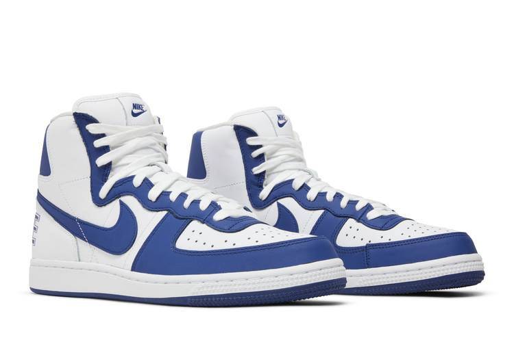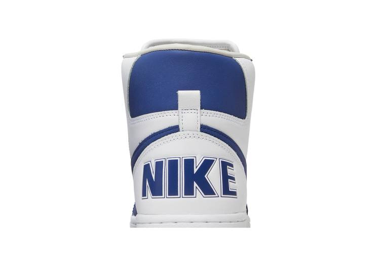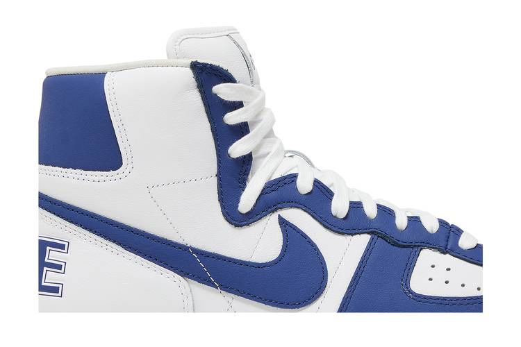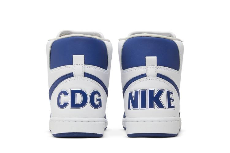 Модель Comme des Garçons Homme Plus x Nike Terminator High 'Navy', созданная в рамках коллаборации из трех частей, выполнена в двухцветной цветовой гамме, вдохновляющей варваров. Эта пара имеет гладкий кожаный верх, белую основу с темно-синими акцентами на носочной части, заднике и фирменном логотипе Swoosh. На пятке правой кроссовки красуется надпись "Nike", а на левой - не менее смелый знак "CDG". Отражая корни обуви 80-х годов, она опирается на традиционную подошву с белыми боковыми стенками и темно-синей резиновой подошвой, тянущейся елочкой.- Артикул: FD4159-100