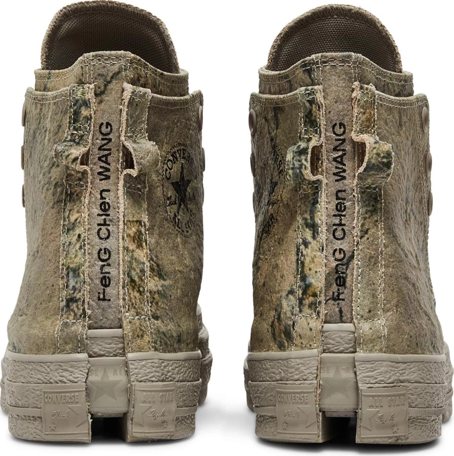 Модель Feng Chen Wang x Converse Chuck 70 High "Concrete Grey" возвращает концепцию кроссовок "2 в 1", которую дизайнер мужской одежды китайского происхождения представил в 2019 году. Обе половинки объединены уникальным графическим принтом на кожаном верхе, напоминающим запечатанный бетон. Помимо напечатанной нашивки All Star на медиальной лодыжке, надпись "Feng Chen Wang" расположена вертикально на задней пятке кроссовка. Высокий верх установлен на преувеличенно прочной подошве, под ногами резиновая подошва, разделенная на четыре различных квадранта.