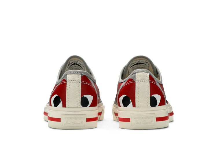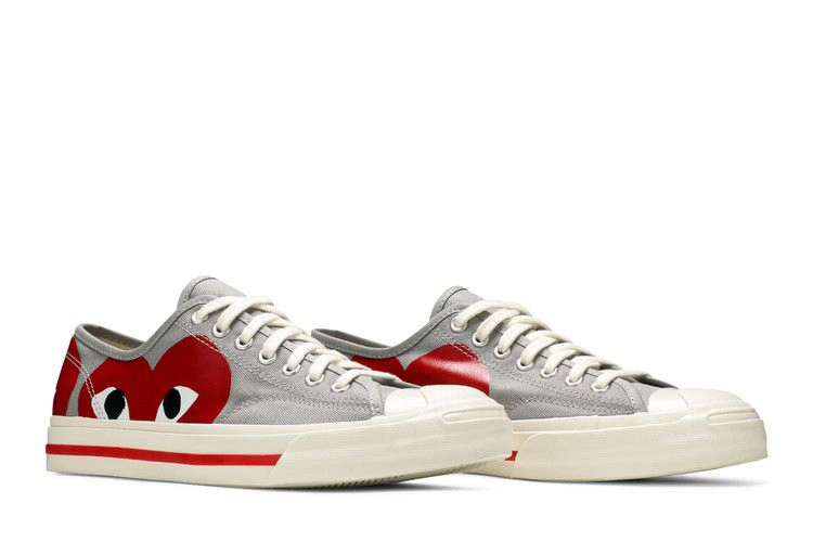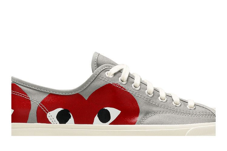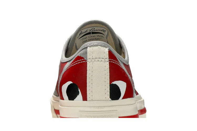 Comme des Garçons PLAY x Converse Jack Purcell 'Drizzle Red' впервые за десятилетие воссоединяет лейбл Rei Kawakubo с моделью Jack Purcell. Мгновенно узнаваемый логотип в виде сердца и глаз, созданный нью-йоркским художником-графиком Флипом Паговски, напечатан и обрезан на каждой боковой панели силуэта низких кроссовок. Серый холщовый задник усилен белым резиновым мыском, на котором изображена фирменная улыбка Джека Перселла. Низкие тапочки на резиновой подошве с красными полосками.