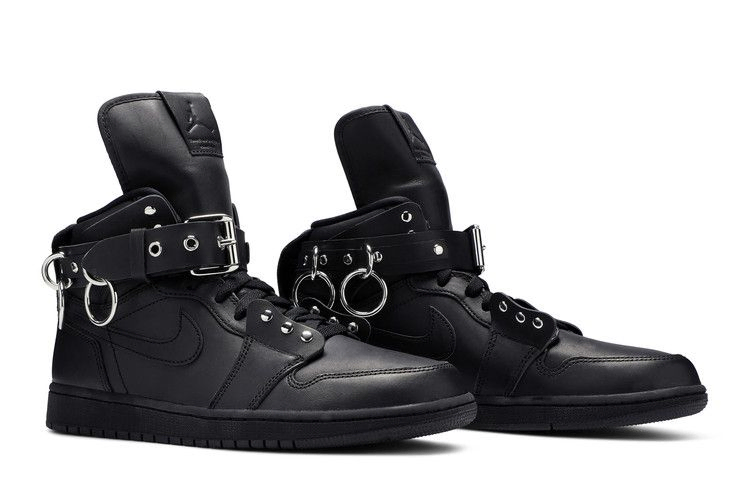 Модель Comme des Garçons x Air Jordan 1 Retro Strap High из коллекции осень-зима 2019 года переосмысливает икону кроссовок через призму панка. Эта версия полностью черного цвета выполнена из премиальной кожи с полированными шипами, удлиненным язычком и тисненым брендингом Jumpman. Ремешок на щиколотке украшен кольцами. В кроссовке использована промежуточная подошва с усиленной вентиляцией и резиновая подошва с точкой опоры, как обычно.