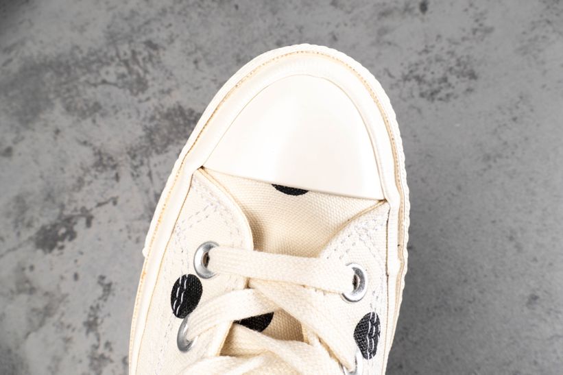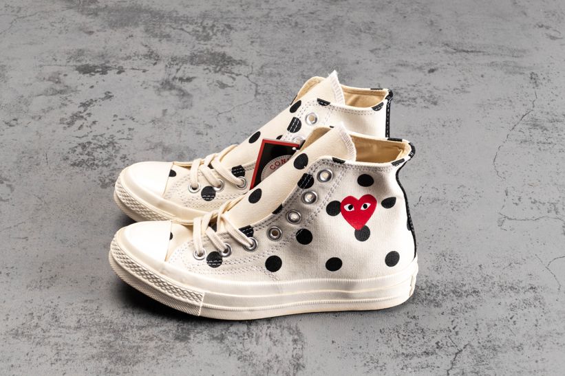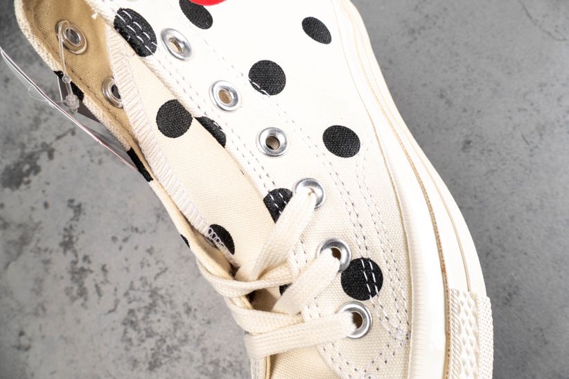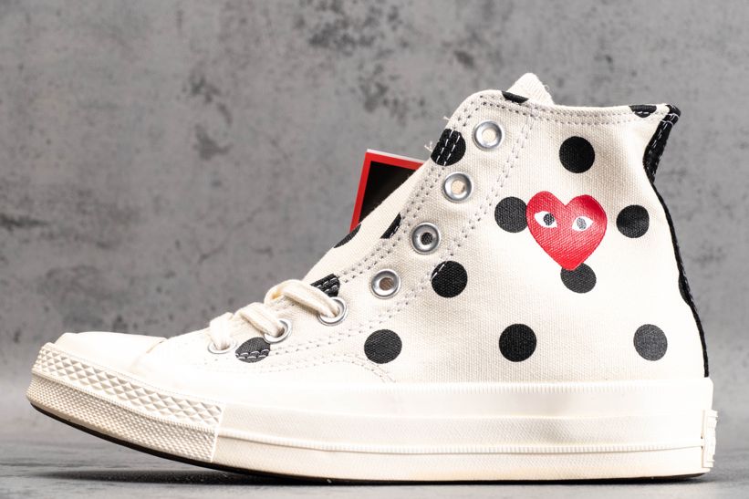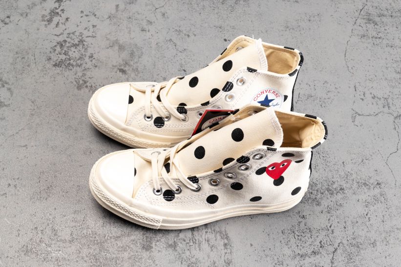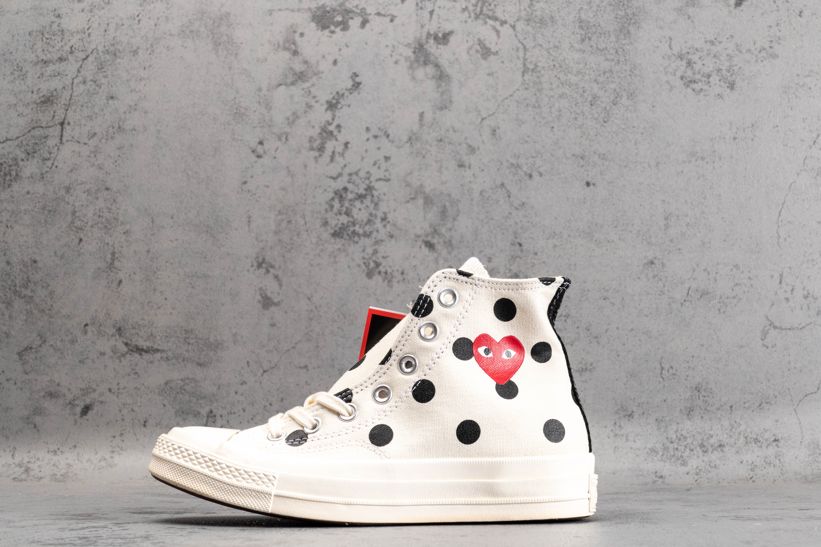 Заказать поиск кроссовок Comme des Garçons x Chuck Taylor All Star 70 Hi White Polka Dot с бесплатной доставкой. Comme des Garçons PLAY x Чак Тейлор All Star 70 High в «Белый горошек» наряду с черным узором в горошек и соответствующей черной полоской на каблуке имеет высокий топ, украшеный фирменным логотипом в виде сердца контрастного красного цвета. В соответствии с минималистской эстетикой обуви глянцевый резиновый носок и подошва отделаны тонально-белым цветом. Ознакомьтесь с подробными фотографиями и закажите эту расцветку Comme des Garçons x Chuck Taylor All Star 70 Hi White Polka Dot в розничных магазинах или в сервисе Slamdunk