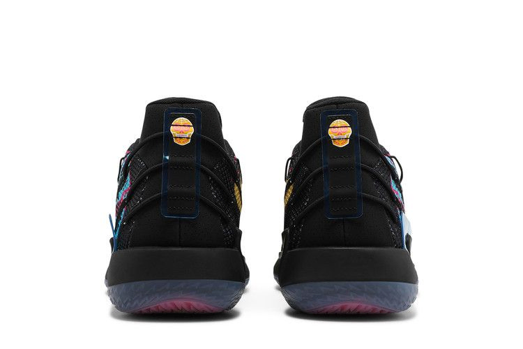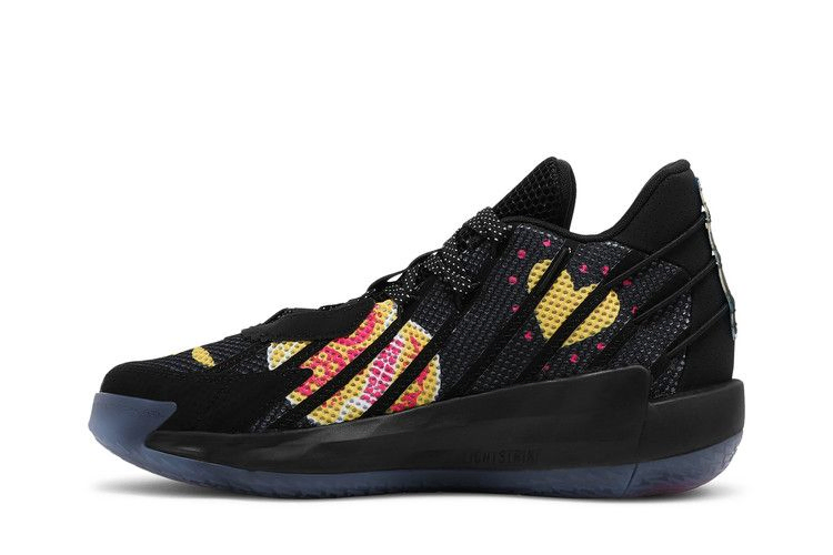 adidas Dame 7 "Day of the Dead" - это седьмые фирменные кроссовки Дэмиана Лилларда, получившие красочное обновление в честь праздника Día de Muertos. Черный текстильный верх кроссовок, украшенный яркими черепами, сердцами и цветочной графикой, опирается на полноразмерную промежуточную подошву Lightstrike, выполненную в черном цвете. Под подошвой из полупрозрачной резины виднеется дополнительный рисунок черепа, который обеспечивает быстрое сцепление с поверхностью.
