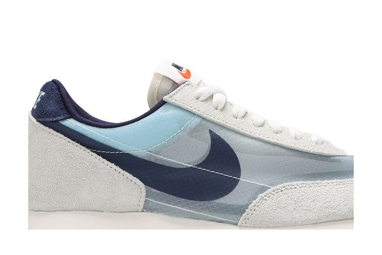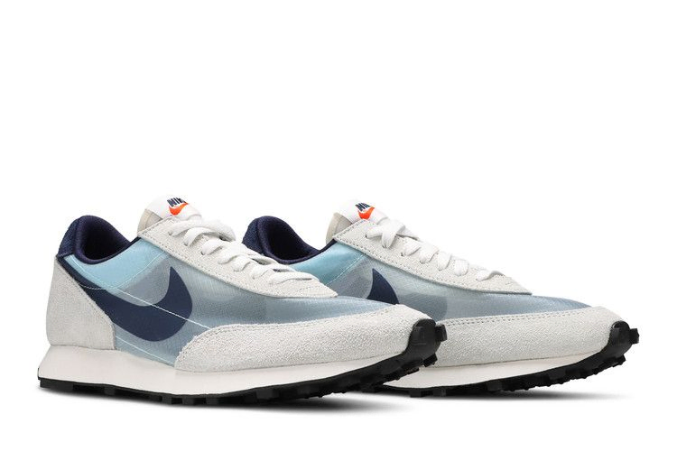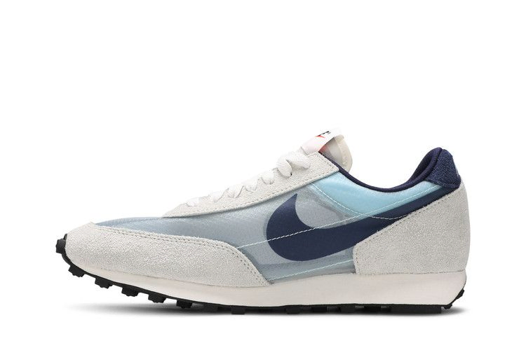 Модель Nike Daybreak SP "Teal Tint" обновляет винтажные кроссовки, создавая верх из полупрозрачного синтетического текстиля Nexkin светло-голубого оттенка и украшая его трафаретным принтом Swoosh цвета Midnight Navy. Замшевые накладки Off-White обеспечивают дополнительную прочность и напоминают об оригинальном дизайне 70-х годов. Кроссовки стоят на мягкой белой подошве из пеноматериала, усиленной классической резиновой вафельной подошвой.