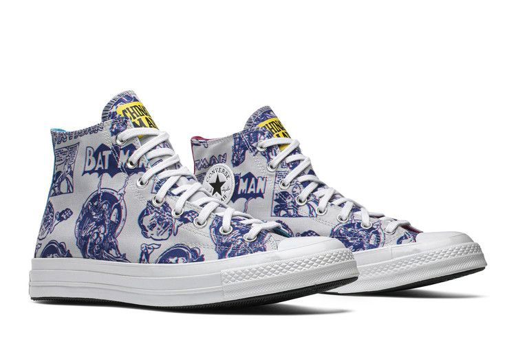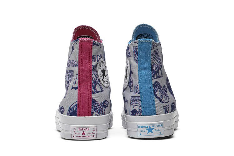 Модель DC Comics x Chinatown Market x Converse Chuck 70 High "3D Batman Print", созданная в рамках совместного проекта, посвященного 80-летию Бэтмена, имеет белый холщовый верх, покрытый ретро 3D-графикой, изображающей Крестоносца в кепке и его помощников. На язычке красуется брендинг Chinatown Market, а на пятке и подкладке каждого ботинка - несочетаемые розовые и тиловые акценты.