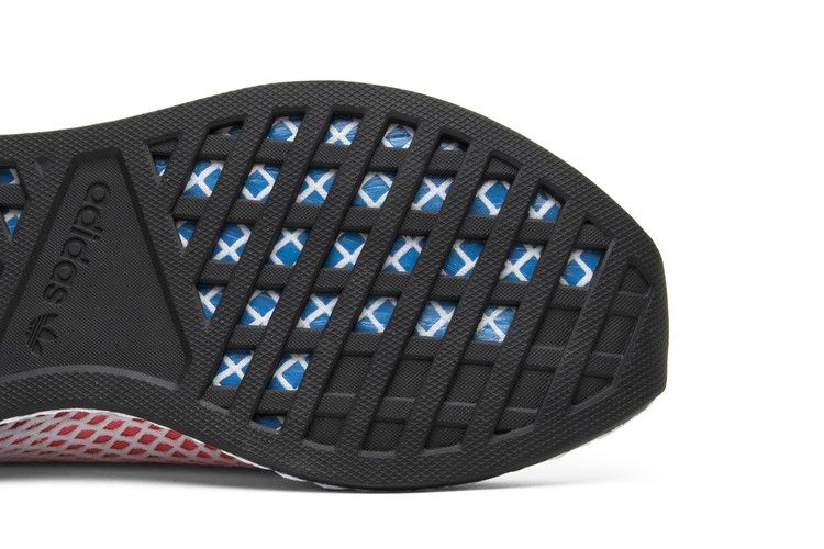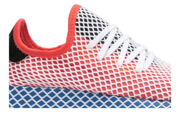 Красно-синяя версия adidas Deerupt имеет сетчатый верх, покрытый сеткой, и носок, напоминающий носок, с подкладкой OrthoLite. Перекрестный рисунок сетки покрывает красную верхнюю часть и простирается до самого низа синей подошвы. Пяточная панель и подошва, выполненные в сплошном черном цвете, выделяются среди сетчатого окружения.