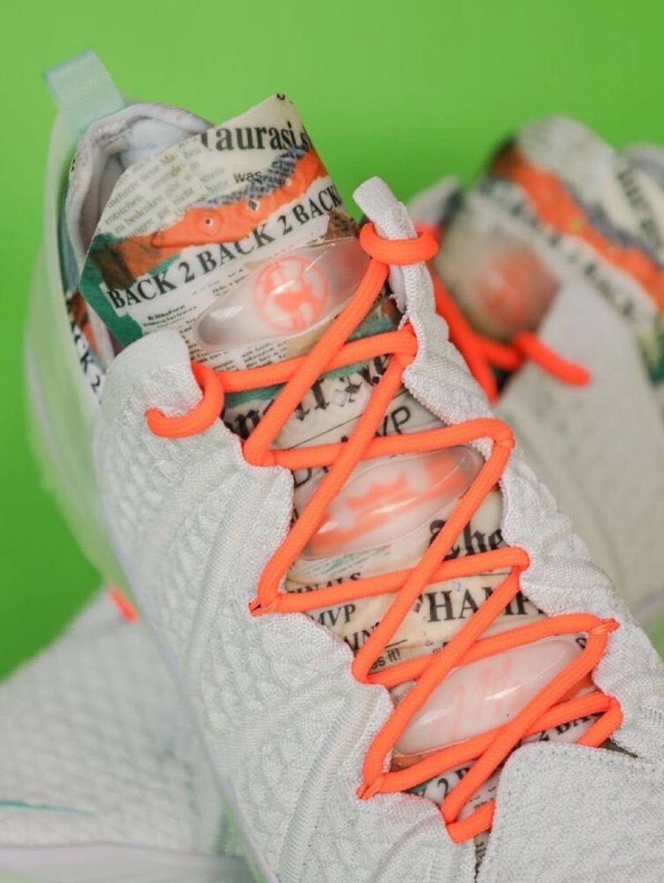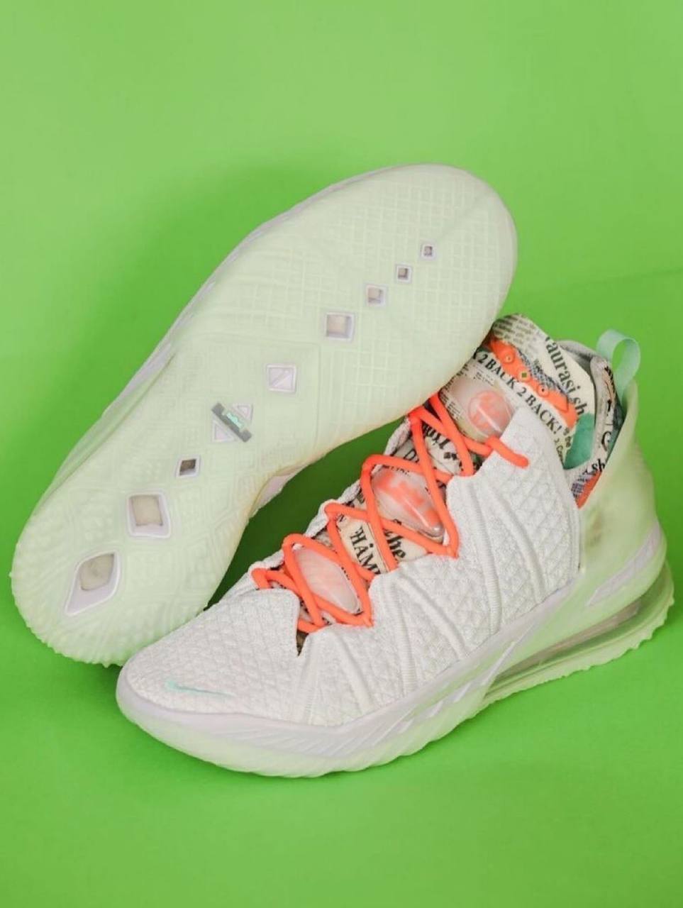 Модель Diana Taurasi x Nike LeBron 18 EP G.O.A.T. обновляет фирменные кроссовки LBJ уникальным дизайном в честь победного пути звезды WNBA. Белый верх из трикотажа KnitPosite закреплен ярко-оранжевыми шнурками и укреплен полупрозрачной пяткой из TPU с бледно-зеленой отделкой. Воротник и язычок украшены коллажем из газетных заголовков, рассказывающих о достижениях Таурази на паркете. Последний имеет декоративную воздушную подушку, украшенную логотипом DT GOAT. Кроссовки установлены на мягкую промежуточную подошву Cushlon, дополненную полноразмерным блоком Zoom Air, который частично помещен в видимый блок Max Air, расположенный в пятке.- Цвета: Blue Tint/Dynamic Turq/Ghost