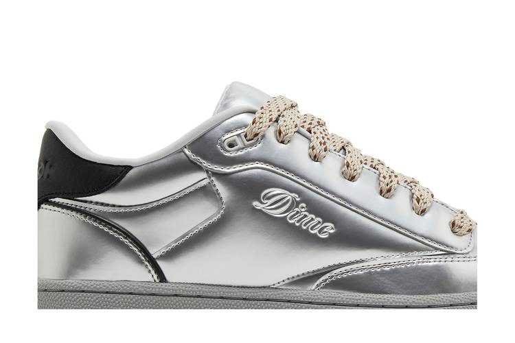 Модель DIME x Reebok Club C Bulc "Metallic Silver" имеет блестящую отделку верха, закрепленную плетеными шнурками и украшенную черными кожаными деталями на носке и заднике. Двойной брендинг расположен на язычке и носочной части, а надпись "Dime" выбита на боковой панели. Низкий топ установлен на прочную резиновую подошву с серыми текстурированными боковыми стенками, клином из пеноматериала на медиальной стороне и подошвой с ромбовидным рисунком цвета загара.