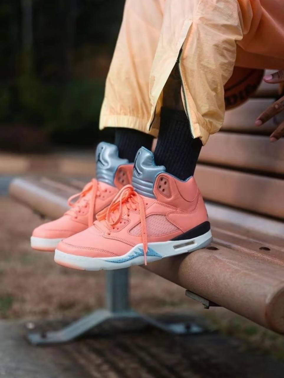 Модель DJ Khaled x Air Jordan 5 Retro "Crimson Bliss", созданная на основе совместной коллекции "We the Best", придает классическому силуэту пастельный оттенок. Верхняя часть изготовлена из кожи кораллового оттенка с атласной стеганой подкладкой цвета Leche Blue. На каждой накладке на пятке имеется вышивка синего цвета с логотипом Nike Air на правом кроссовке и надписью "We the Best" на левом. Традиционный брендинг Jumpman украшает серебристый светоотражающий язычок. Кроссовки установлены на белую полиуретановую промежуточную подошву с синими крапинками в виде акульих зубов и видимым блоком подошвы Air в пятке. Под подошвой располагается полупрозрачная резиновая подметка с несовпадающими логотипами Jumpman и "We the Best".- Цвета: Crimson Bliss/Leche Blue/Sail