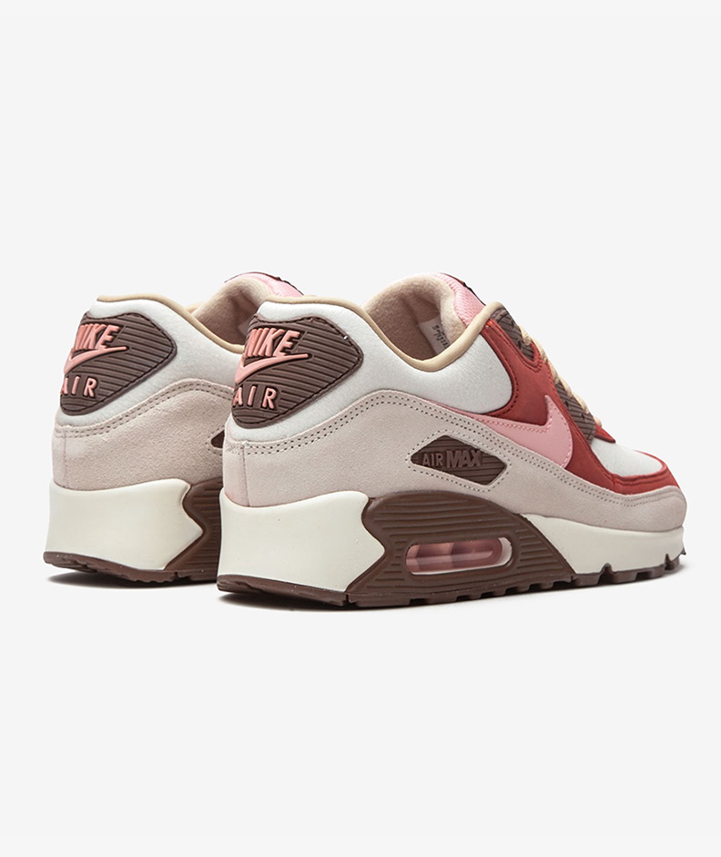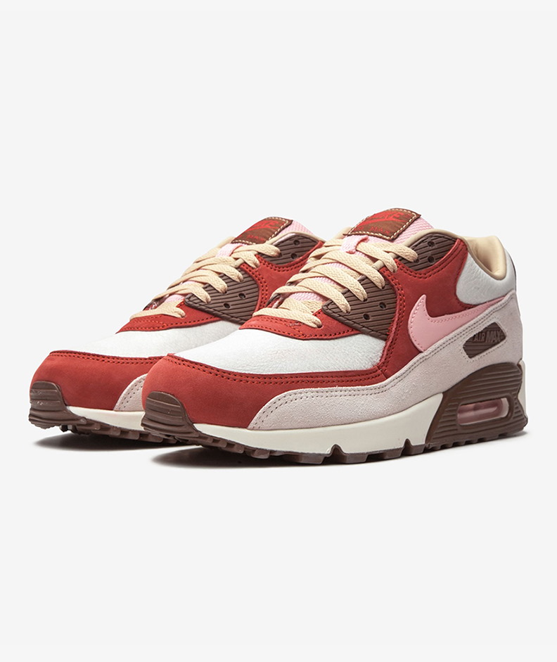 В переиздании 2021 года DQM x Nike Air Max 90 'Bacon' возвращается желанная расцветка, первоначально выпущенная в 2004 году в сотрудничестве с Dave's Quality Meat. Расцветка кроссовок с кремовой кожаной основой, с красными замшевыми накладками, розовым кожаным логотипом Swoosh и коричневыми вставками из термопласта создает впечатление полос бекона. Концепция отразила уникальную эстетику мясного магазина легендарного бутика кроссовок в Нью-Йорке, основанного в 2003 году Дэйвом Ортисом и Крисом Кифом.