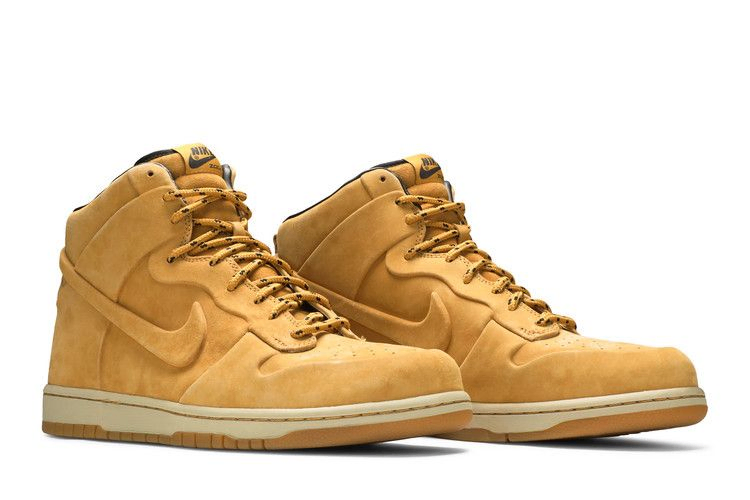 В Dunk High Premium 'Wheat Pack' использована конструкция Vac Tech. Классическая бесшовная конструкция Nike переосмыслена с помощью пшеничного оттенка верха. Коричневый кожаный носок и шнурки повторяют дизайн культовых моделей рабочей одежды, а подошва из резины завершает образ.