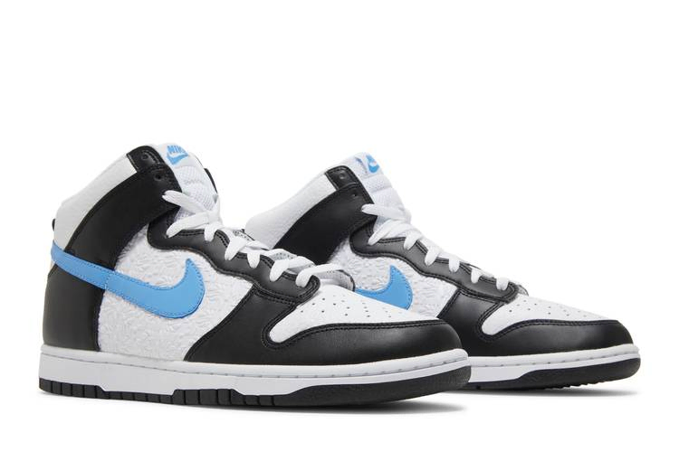 Nike Dunk High EMB 'University Blue' привносит в ретро-обувь уникальный 3D-элемент дизайна. Верхняя часть кроссовок полностью выполнена из кожи и сочетает в себе белую основу с контрастными черными накладками и фирменным логотипом Swoosh цвета University Blue. На задней панели красуется рельефный узор в виде слова Nike и баскетбольного мяча с эмблемой Swoosh в виде повторяющегося узора. В основе кроссовок лежит традиционная подошва, подчеркнутая белыми боковинами и прочной черной резиновой подошвой.