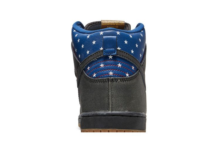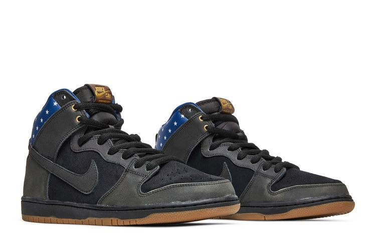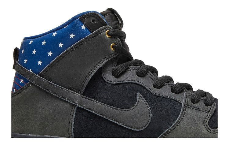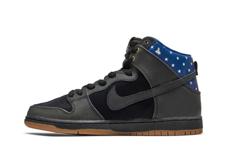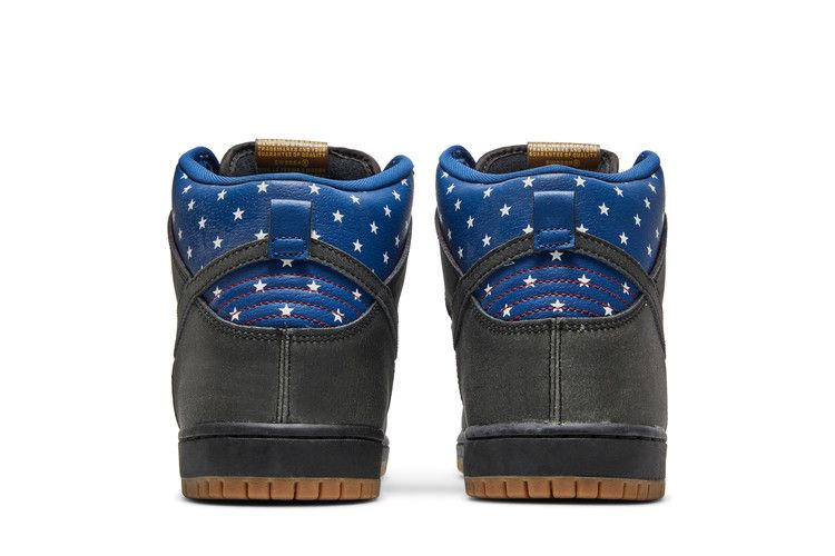 Лимитированная модель Nike Dunk High Premium SB 'Stars', выпущенная в июне 2014 года, имеет черный верх из нубука и кожи, украшенный темно-розовым синим цветом и патриотическими звездами на воротнике. Кроме того, в комплект входит черная межподошва, резиновая подошва и стелька с изображением звезд и полос.