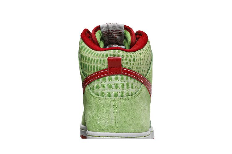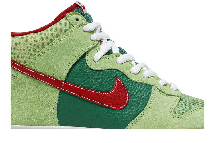 Модель Nike Dunk High Pro SB "Dr. Feelgood" вдохновлена обложкой пятого альбома группы Mötley Crüe. Верхняя часть кроссовок выполнена в двух оттенках зеленого цвета с отделкой из кожи, принт под рептилию на носочной части и воротнике, а также накладки из замши. Красные акценты Varsity Red присутствуют на внутренней подкладке, Swoosh и подошве, а белая межподошва создает дополнительный контраст.