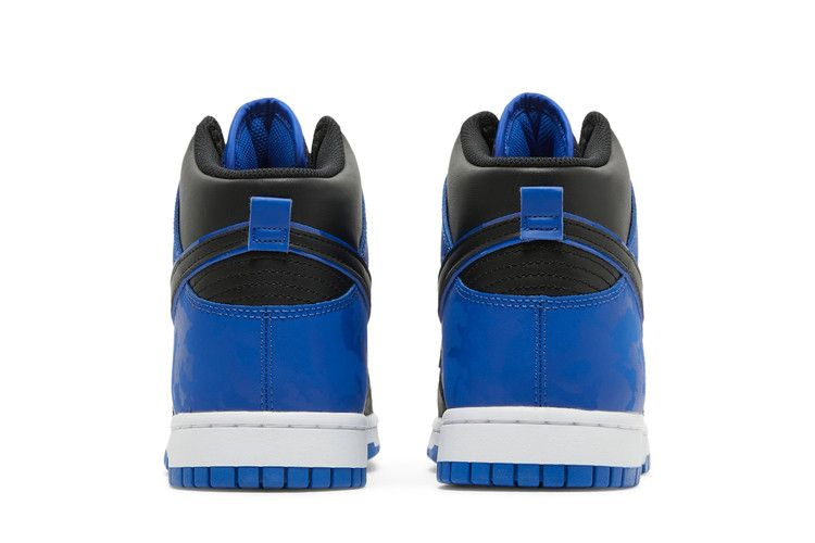 Nike Dunk High SE 'Hyper Royal Camo' выполнены в простой двухцветной цветовой гамме с едва заметными дизайнерскими изысками. Они представлены в виде тонального камуфляжного принта на носочной и пяточной частях кроссовка, выполненного в черном и королевском синем цветах соответственно. Остальная часть верха выполнена из гладкой черной кожи с подобранным по цвету логотипом Swoosh, выделенным королевским синим. Брендинг Nike украшает носок и язычок из нейлона с легкой набивкой, последний украшен светоотражающим рисунком в виде сетки. Прочная резиновая подошва белого и синего цвета поддерживает вершину.- Артикул: DD3359-001