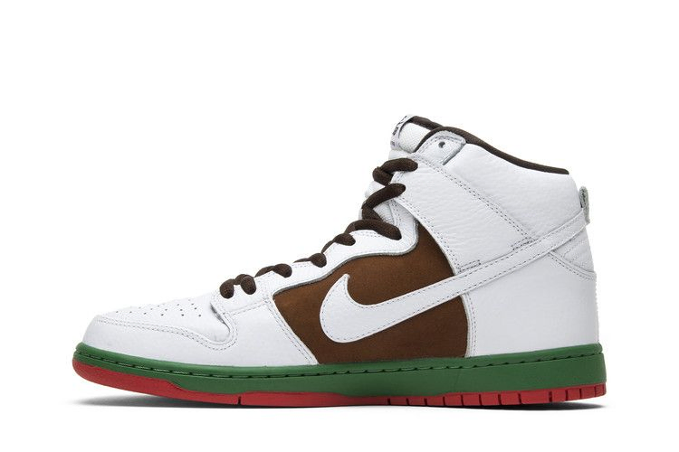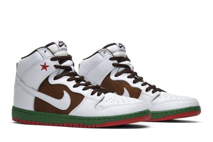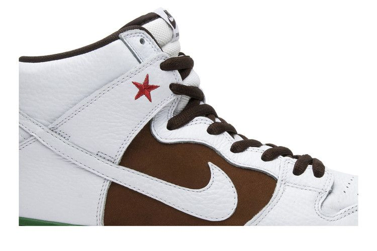 Nike Dunk High SB 'Cali' - это переиздание модели 2004 года Nike SB Dunk Low 'Cali'. Вдохновленная цветами флага штата Калифорния, модель, выпущенная в августе 2014 года, имеет верх из белой кожи с коричневым оттенком Pecan Brown на задней панели, зеленую промежуточную подошву, красную подошву и пришитую красную звезду на боковой стороне.