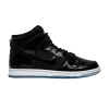 Модель Dunk High SB PRM 'Space Jam' имеет знакомый дизайн, вдохновленный классической расцветкой Air Jordan 11. Однотонные черные кроссовки выполнены из блестящей лакированной кожи, баллистической сетки на задней панели и зернистой кожи на воротнике. На язычке присутствует едва заметный оттенок королевского синего, а клеймо "SB" на пятке напоминает о "23" на Air Jordan 11. Ледяная полупрозрачная подошва завершает образ.
