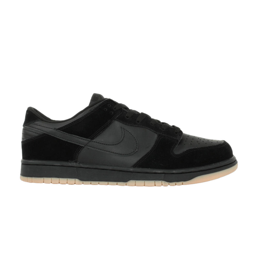 Nike Dunk Low выполнены в полностью черном цвете, а верхняя часть состоит из кожи и замши. Выпущенные в 2003 году, эти кроссовки представляют собой модифицированный силуэт оригинальной версии, разработанной Питером Муром, которая была выпущена в 1985 году в виде хай-топа. Низкая версия, модифицированная для повседневной носки, оснащена заметным брендингом Nike Swoosh, перфорацией в области носка и подошвой из резиновой резины, завершающей образ.