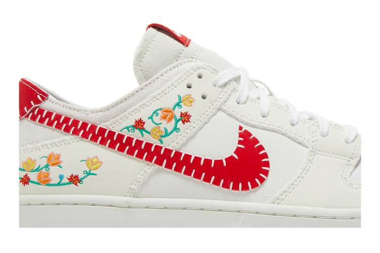Nike Dunk Low Decon SB 'Sail University Red', выпущенные в рамках коллекции Nike 2023 N7, демонстрируют выразительный дизайн, созданный в сотрудничестве с членами конфедерации Хауденосауни и общины оджибве. Модель имеет деконструированную конструкцию с открытым пенопластовым язычком и уменьшенной подкладкой вокруг воротника, а верхняя часть выполнена из белого холста с замшевыми накладками с цветочной вышивкой. Декоративная строчка обрамляет красный кожаный логотип Swoosh и пяточную вкладку с логотипом N7. Кроссовки оснащены прочной подошвой с белыми боковыми стенками и полупрозрачной резиновой подошвой.