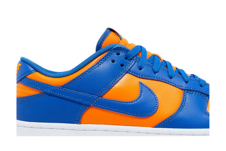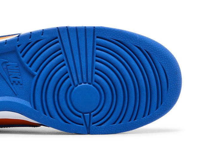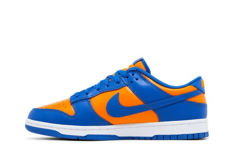 Nike Dunk Low "Knicks" - это винтажные кроссовки 80-х годов, выполненные в официальных цветах знаменитой нью-йоркской франшизы NBA. Низкие кроссовки выполнены из гладкой кожи и имеют оранжевую основу с контрастными голубыми накладками и подобранным по цвету логотипом Swoosh. Брендинг Nike присутствует на язычке, носочной части и заднике. Кроссовки имеют прочную подошву с прошитыми боковыми стенками и резиновую подошву, изначально созданную для игры на твердом покрытии.