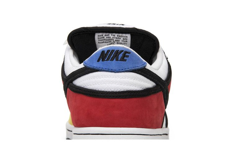 Эти Nike Dunk Low Pro SB вдохновлены современным искусством: смелые черные линии и основные цвета напоминают о работах голландского художника Пита Мондриана. Уникальный дизайн нанесен на белое полотно, а замшевая конструкция украшает черный Swoosh, синий язычок на пятке и красно-желтые накладки на носке и пятке. Набивной язычок символизирует эпоху золотых коробок бренда.