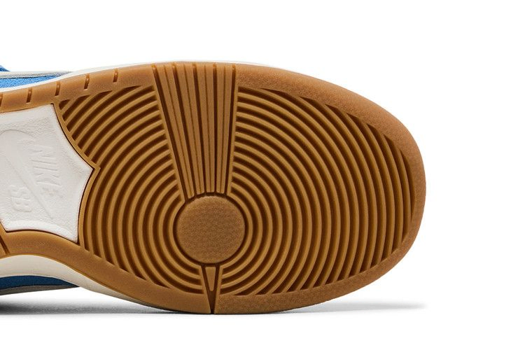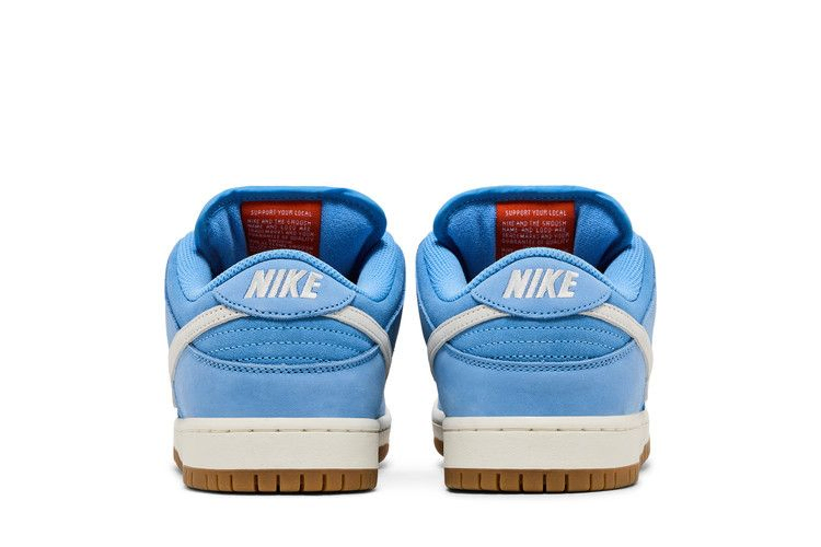 Модель Nike Dunk Low Pro SB "University Blue Gum" выполнена из замши пудрового синего цвета с тональными накладками из нубука и белым кожаным логотипом Swoosh. Плетеная бирка Nike SB украшает набивной сетчатый язычок, а вышитый знак Nike украшает задник из нубука. Брендинг Nike SB "Orange Label" красуется на носочной части, а в пятке расположен амортизирующий блок Zoom Air.