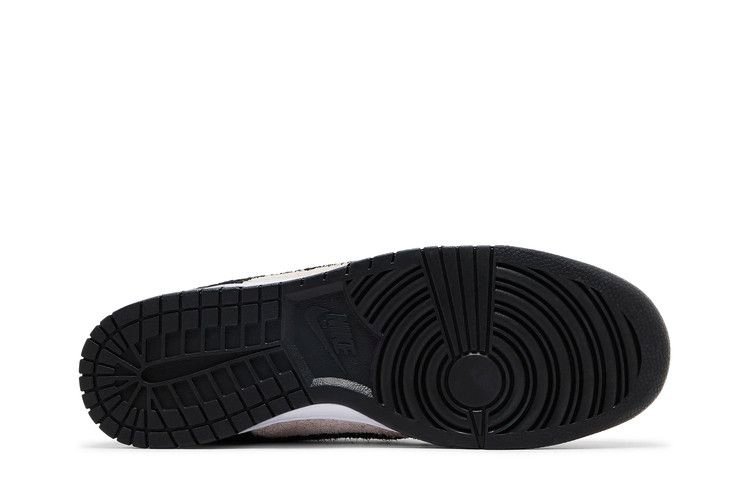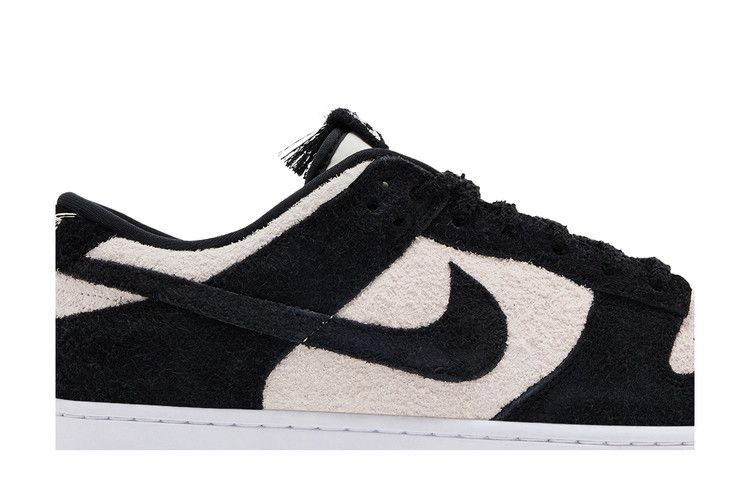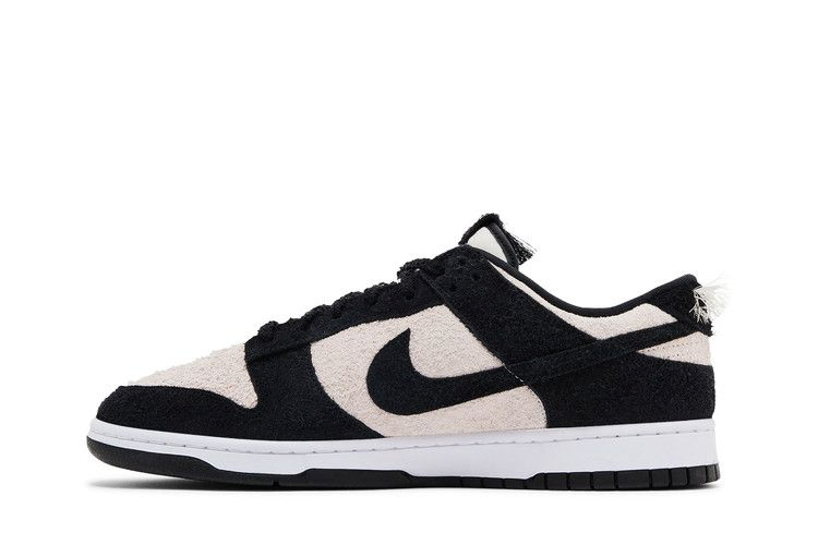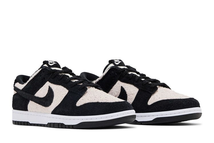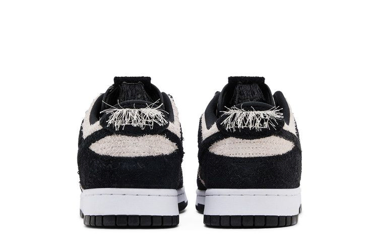 Nike Dunk Low SE "Black Suede", выпущенные в рамках пакета "Panda-Monium Pack", заменяют традиционную кожаную конструкцию ретро-силуэта на мохнатый замшевый верх. Текстурированный материал сочетает в себе белую основу с контрастными черными накладками и подобранным по цвету логотипом Swoosh. Масса свободных нитей украшает пяточный язычок, а также вышитую графику панды, которая появляется на внутренней стороне язычка.