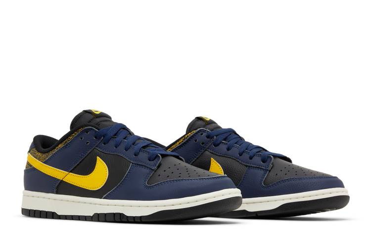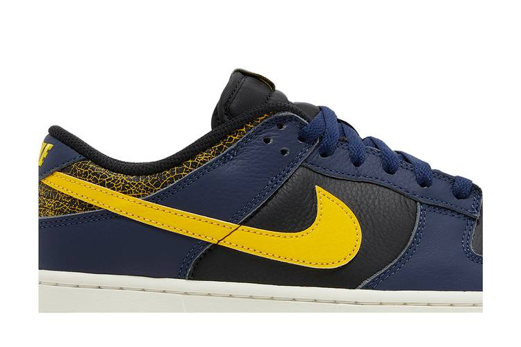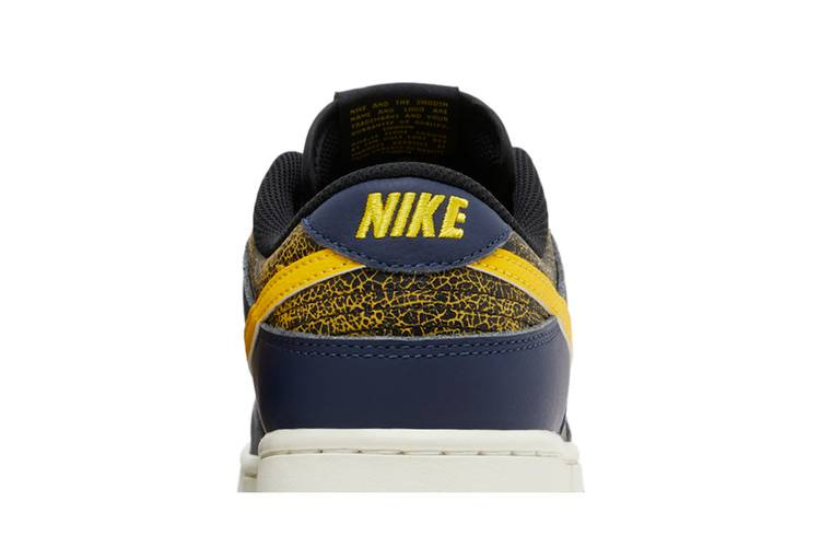 Ретро-силуэт Nike Dunk Low "Vintage Michigan" выполнен в фирменных цветах "Росомах". Верхняя часть кроссовок полностью выполнена из кожи и имеет черную основу с накладками цвета Midnight Navy на носочной и пяточной частях. Кожаный логотип Swoosh окрашен в желтый цвет Tour Yellow, что соответствует брендингу Nike, украшающему язычок и задник. Детали из потрескавшейся кожи на низком воротнике подчеркивают винтажную эстетику кроссовок. Резиновая подошва подчеркнута белыми боковыми стенками и черной подошвой.