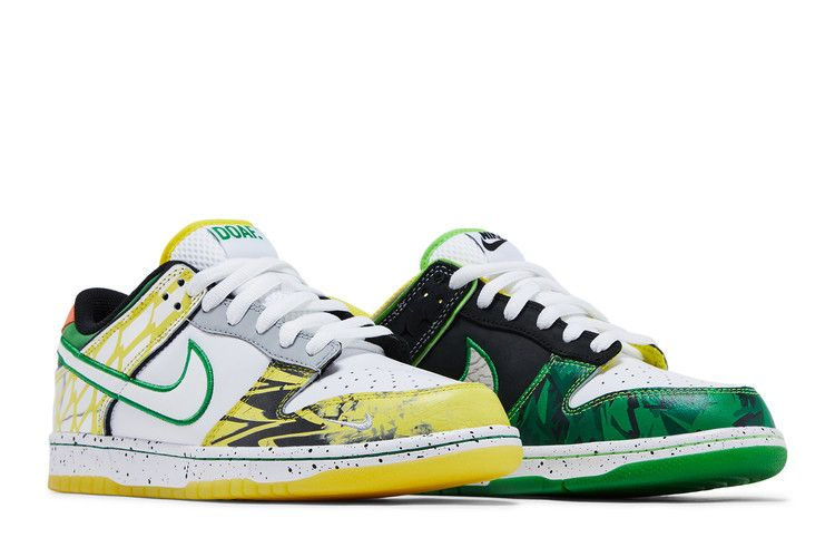 Модель Dunk Low 'What the Duck - University of Oregon Away' PE отдает дань уважения архиву футбольной формы Орегонского университета, символизируя традицию программы надевать новую форму на каждую игру. На левом и правом ботинках представлено более 11 различных дизайнов. Среди деталей - воротник с талисманом школы Fighting Duck и комплект 2016 года "The Duck"; панель, воссоздающая принт топографической карты на комплекте 2015 года "Oregon Pioneer"; а также отпечаток слона на средней части стопы Swoosh, напоминающий о Air Jordan 3 Тинкера Хэтфилда и костюмах команды "Jumpman" 2018 года. Созданные в партнерстве с Division Street's Ducks of a Feather, сокращенное обозначение "DOAF" вышито на левом язычке пятки и правом язычке. Кроссовки поставляются в комплекте с книгой "Инновационный университет" - 460-страничной хроникой в твердом переплете, рассказывающей о культурном и спортивном подъеме Орегонского университета. Книга рассказывает эту историю через искусство, анекдоты и интервью с игроками, тренерами и дизайнерами.