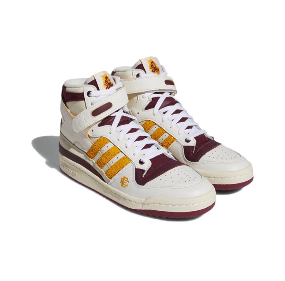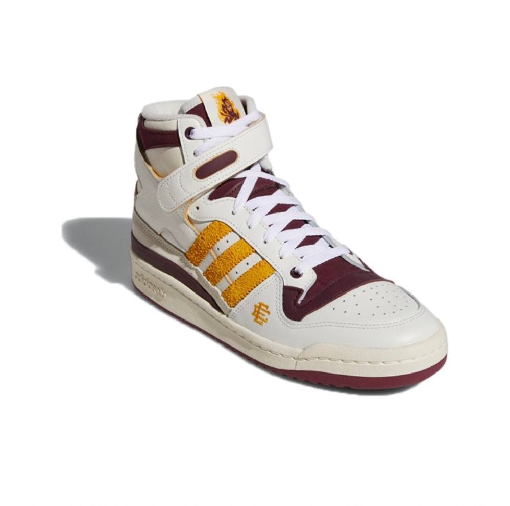 Модель Eric Emanuel x Midnight Madness x adidas Forum 84 High "Arizona State Sun Devils" взята из совместной коллекции, вдохновленной баскетболом в колледже. Эта модель посвящена Университету штата Аризона и имеет верх из белой кожи с золотыми полосами из ворсистой замши и насыщенными бордовыми акцентами. Талисман "Солнечных дьяволов" красуется на тканом язычке, а надпись "Arizona State" нанесена на замшевую накладку на пятке. Двойной логотип Emanuel "E" вышит на боковой носочной части. Винтажные кроссовки изготовлены на прочной резиновой подошве с открытым клином EVA на медиальной боковине.