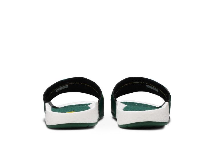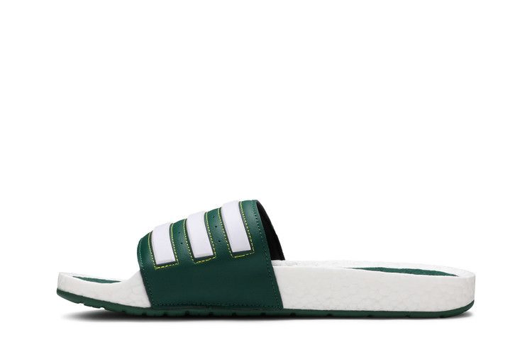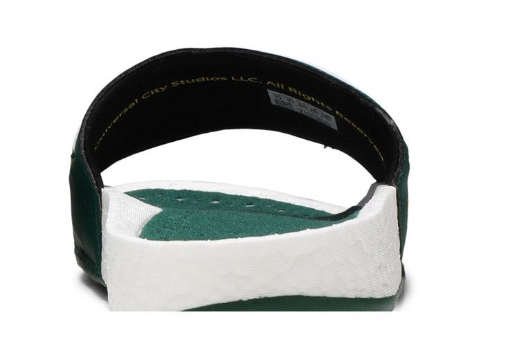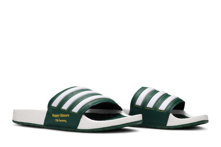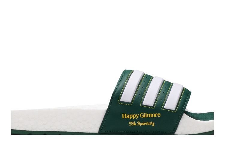 Сандалии Extra Butter x Happy Gilmore x adidas Adilette Boost Slide 'Happy' посвящены 25-летию комедийного фильма Адама Сэндлера, в центре которого - неудачливый хоккеист, не желающий играть в гольф. Нью-йоркский бутик кроссовок Extra Butter одел сандалии в сочно-зеленый верх из искусственной кожи, украшенный белыми полосками и надписью "Happy Gilmore 25th Anniversary" на боковой стороне. Двойной брендинг adidas и Extra Butter украшает зеленую стельку, которая располагается на полноразмерной промежуточной подошве Boost.