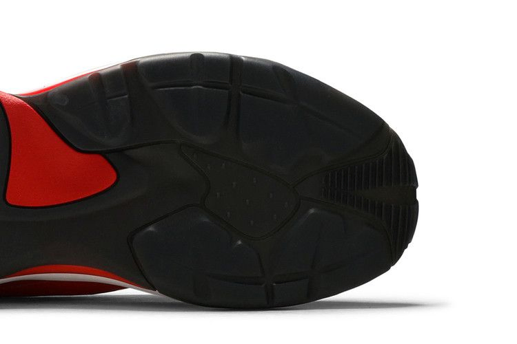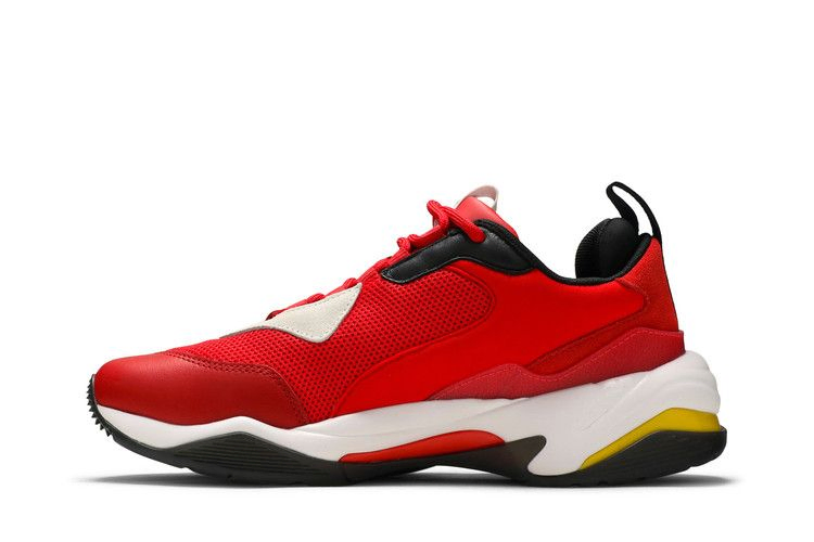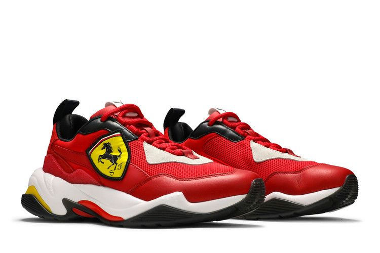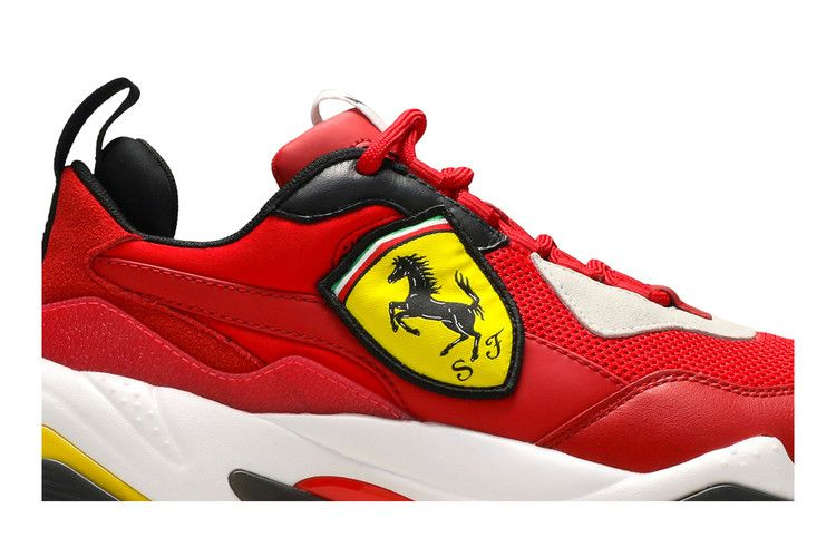 Воплотив в себе элементы дизайна от Puma и знаменитой марки автомобилей класса люкс, Ferrari x Thunder 'Rosso Corsa' отсылает к прошлым коллаборациям, создавая яркий, обтекаемый силуэт. Внешний вид вдохновлен кроссовками 90-х Cell System, с верхом из сетки, замшевыми накладками и ретро-инструментами. Смелые цветовые блокировки также напоминают об эпохе, как и завышенная межподошва. Ко-брендинг в виде логотипа Ferrari и полосок Formstrip завершает образ.
