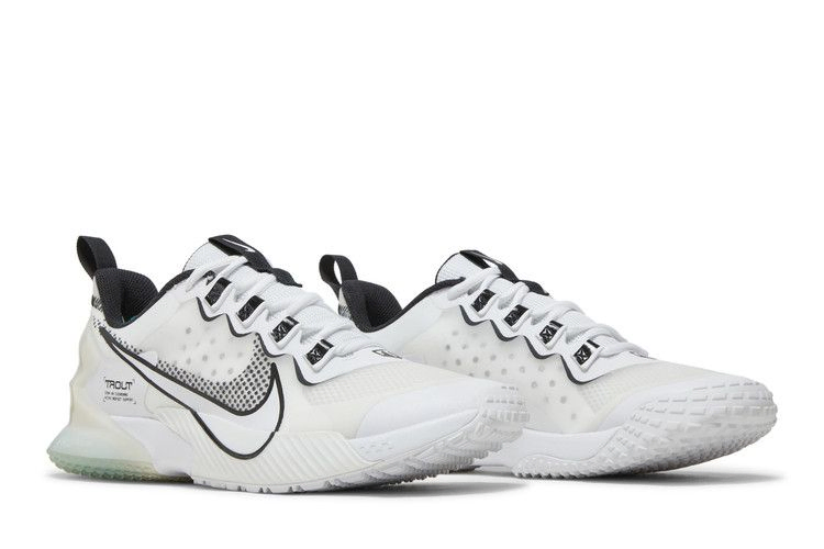 В Nike Force Zoom Trout LTD TF 'White Black' фирменная обувь Майка Траута приобрела простой двухцветный дизайн. Дышащий верх выполнен из белой полупрозрачной сетки с тональными накладками без швов и формованным полупрозрачным фиксатором пятки. На боковой стороне пятки имеется надпись "Trout", а на носке - личный логотип спортсмена. Легкая амортизация обеспечивается межподошвой из пеноматериала с двухкамерной подушкой Zoom Air в пятке, одна из которых служит для поглощения ударов, а внутренняя - для отскока. Под ногами резиновая подошва с рисунком сцепления, предназначенным для игровых поверхностей.
