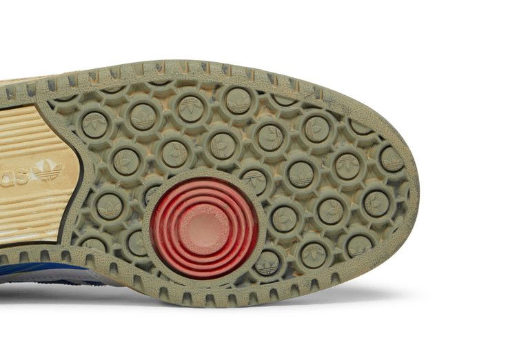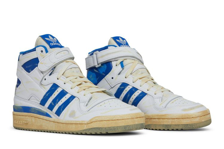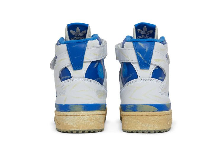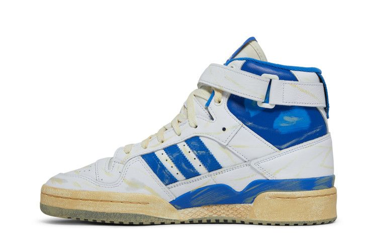 В модели adidas Forum 84 High 'Worn Blue' ретро-обувь получила новый облик. Верхняя часть из белой кожи с контрастными синими акцентами на воротнике, пятке и фирменных трех полосках имеет следы потертостей и обесцвечивания. Неизменными остались такие детали, как регулируемый ремешок на щиколотке и Х-образная накладка. Белая резиновая подошва с клином из EVA на медиальной стороне имеет предварительно пожелтевшую поверхность.