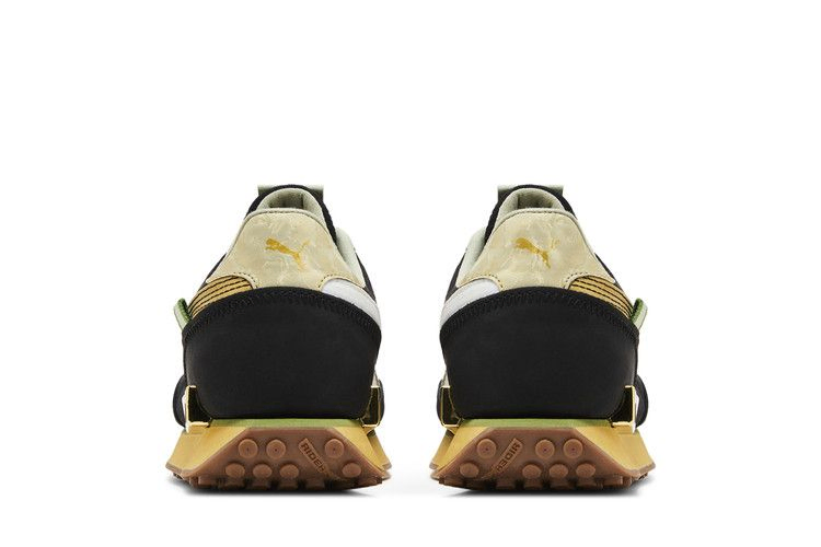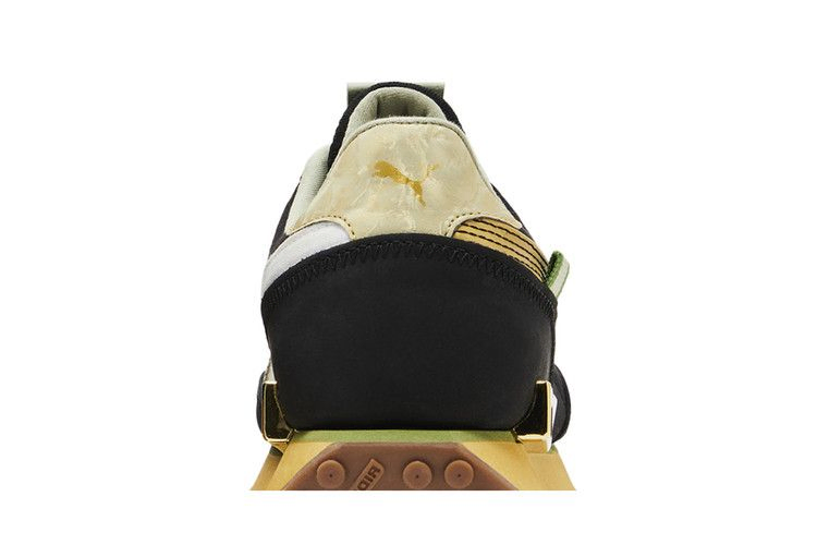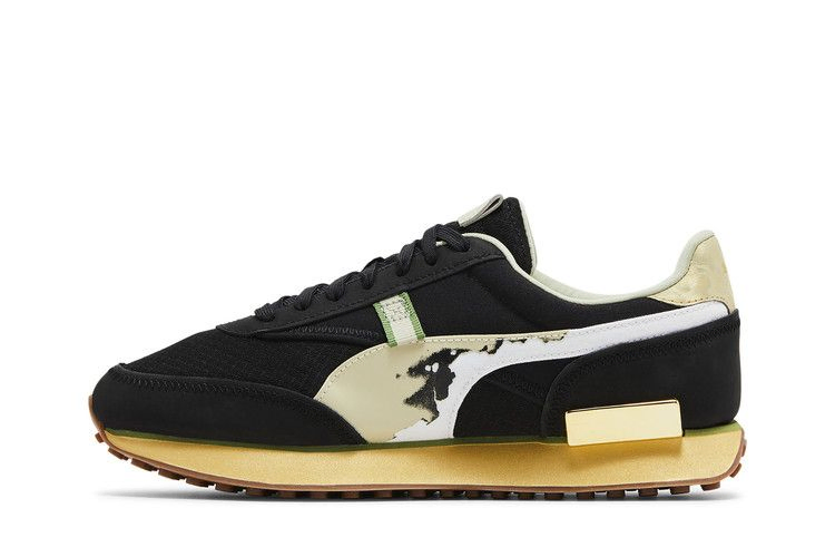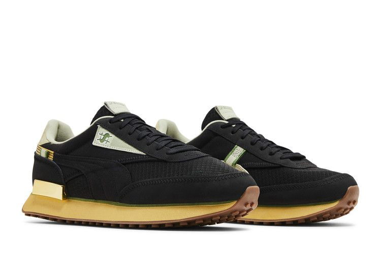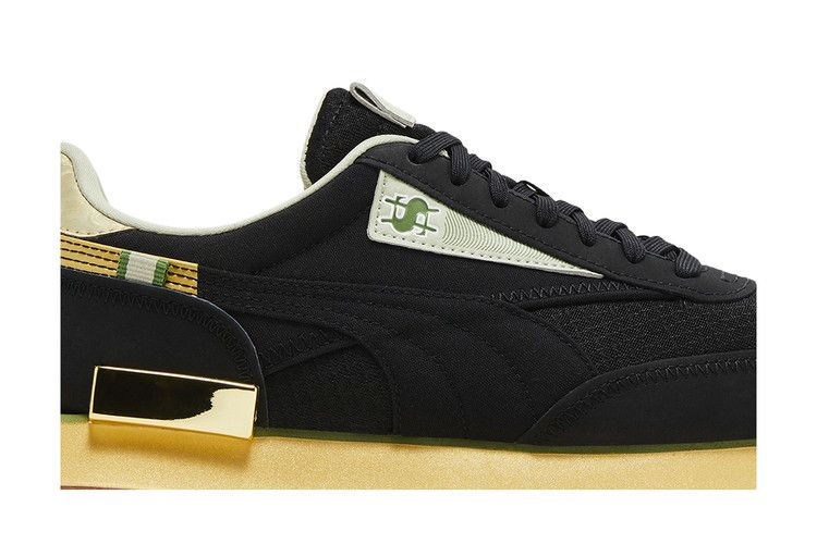 Модель PUMA Future Rider 'Big Spender' обновляет ретро-стиль бега с игривым мотивом валюты. Верх выполнен из черного текстиля с накладками из синтетической замши в тон, украшенными зигзагообразной строчкой. Банкнота выглядывает из-под бокового наглазника, а деталь из TPU, встроенная в предварительно пожелтевшую промежуточную подошву из EVA, сияет золотым металликом. Подошва с фирменной подошвой Federbein от PUMA изготовлена из прочной резины.