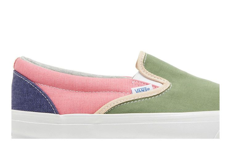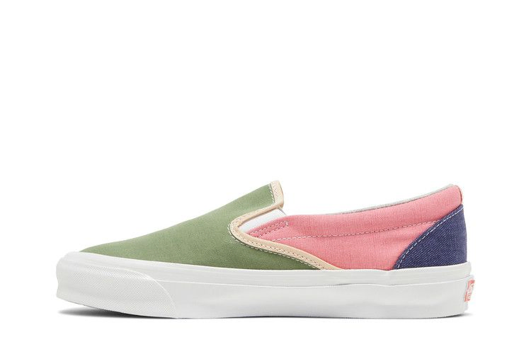 Модель Geoff McFetridge x Vans Vault OG Classic Slip-On LX 'Transcentcoastal' взята из капсульной коллекции, выпущенной в сотрудничестве с художником и иллюстратором из Лос-Анджелеса. Низкие кеды выполнены из текстиля в стиле колор-блок с розовой четвертью, накладкой на пятке цвета индиго и зеленым мыском с контрастной зеленой окантовкой. Внутри обуви стелька и внутренняя подкладка украшены графикой в виде синего парусника. Подошва из резины с вафельным рисунком обеспечивает надежное сцепление с поверхностью.