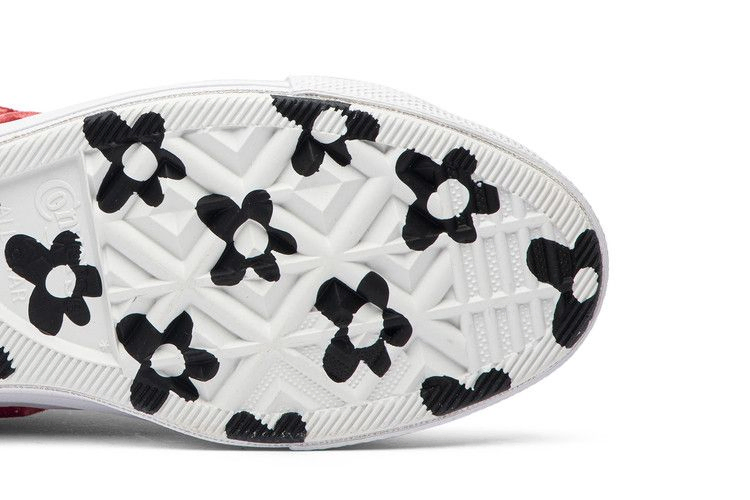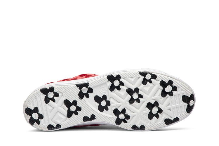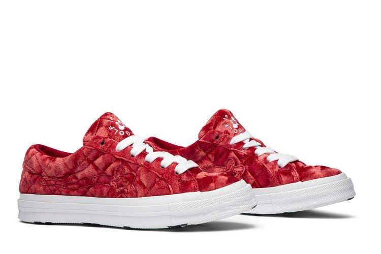 Кеды Golf Le Fleur x One Star 'Quilted Velvet Cherry', выпущенные в рамках пакета Quilted Velvet Pack, - это совместная работа Тайлера Креатора и Converse. Кеды с низким верхом выполнены из стеганого бархата красного цвета с вышитым брендингом на язычке и средней части стопы в фирменном цветочном дизайне. Традиционные хлопковые шнурки, сохраняющие классический стиль Converse, обеспечивают плотную посадку, а белые промежуточная подошва и подошва завершают образ и придают обуви дополнительную привлекательность.
