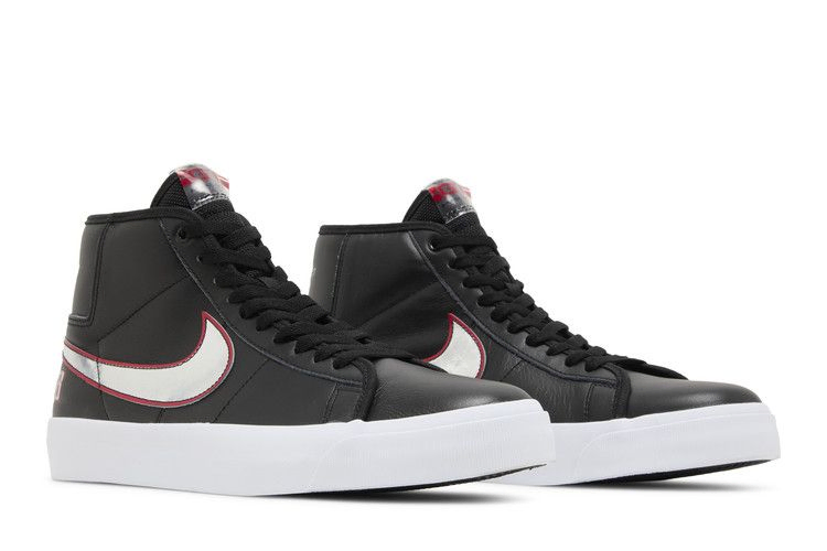 Модель Grant Taylor x Nike Zoom Blazer Mid SB 'El Camino' с черным кожаным верхом, украшенным серебристым металликом Swoosh с темно-малиновой окантовкой. Подпись Гранта Тейлора напечатана на заднике, а "98" - на боковой пятке. В стельку встроен пружинящий блок Zoom Air с красочной графикой, повторяющей гоночные наклейки. Подошва из вулканизированной резины, укрепленная подошвой из резины с елочным рисунком, выполнена в суровом белом цвете.