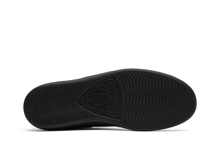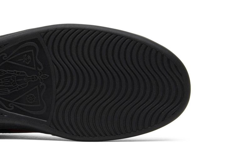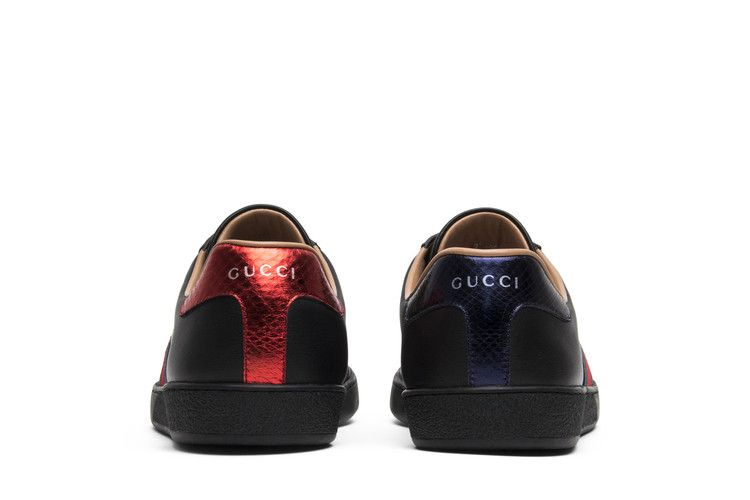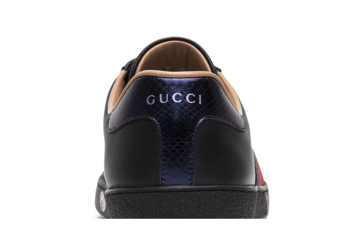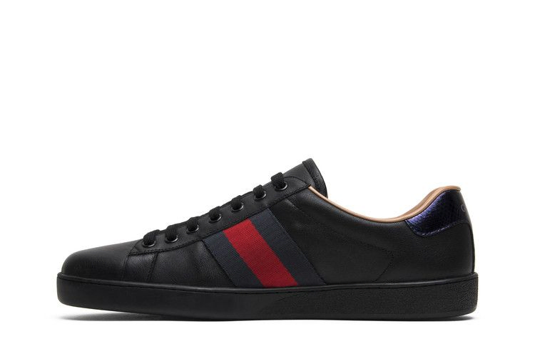 Изготовленные в Италии кроссовки Gucci Ace со шнуровкой отличаются классическими линиями и минималистичным силуэтом, выполненным из черной кожи с нейлоновой тесьмой на задней панели. Декоративная деталь, выполненная в контрастных темно-синих и красных полосах, украшена вышитой пчелой. Простой дизайн завершают вставки на пятке из змеиной кожи, выполненные в красном цвете на левом ботинке и фиолетовом на правом.