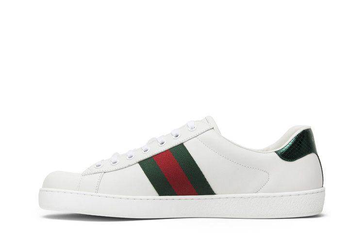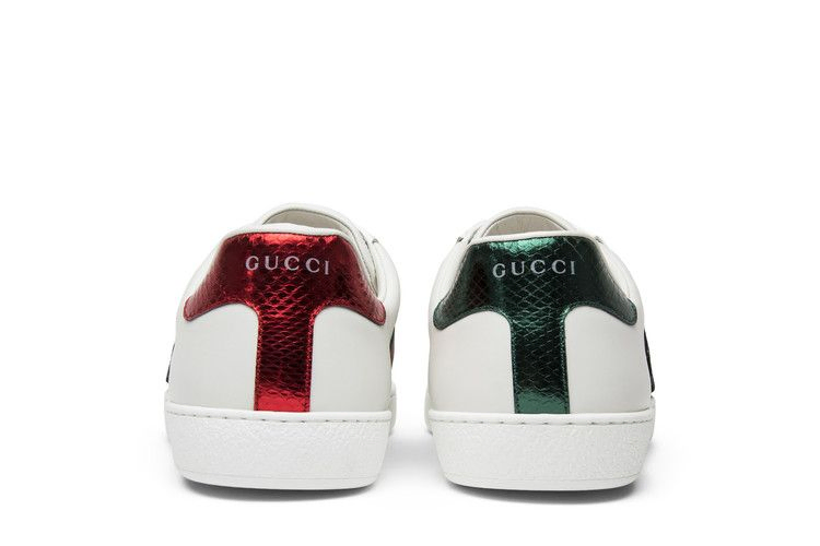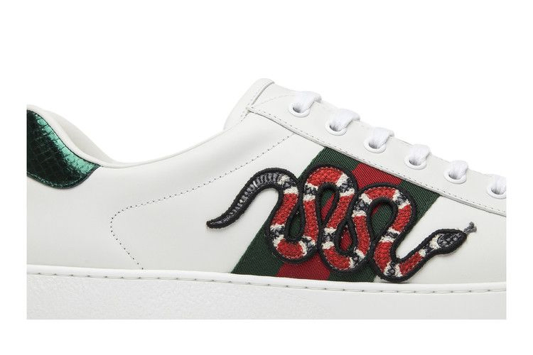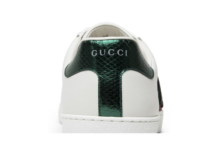 Низкие кроссовки Ace от Gucci украшены фирменной вышивкой King Snake на классической зелено-красной паутине. Верх из белой кожи премиум-класса украшен зелеными деталями из змеиной кожи на пятке в качестве завершающего штриха.