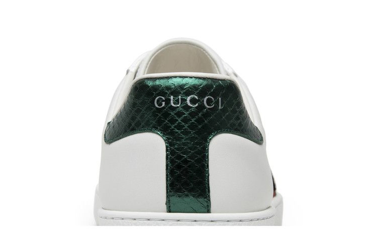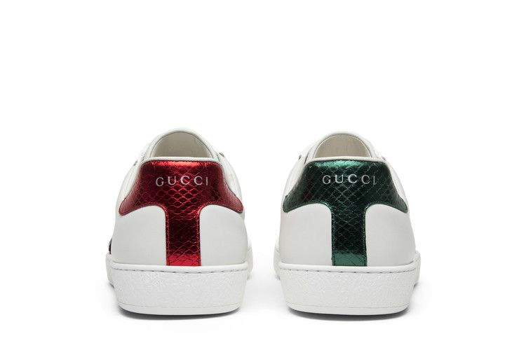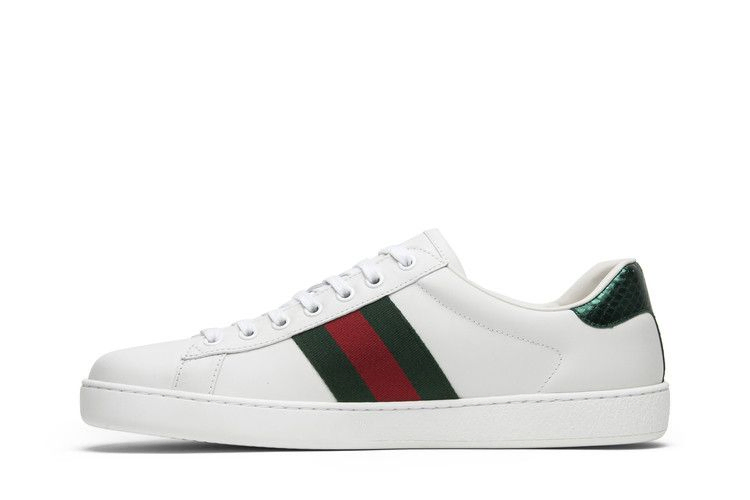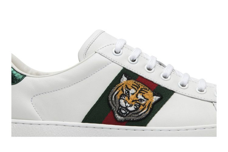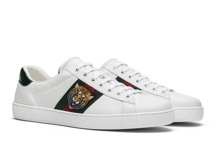 Gucci Ace, низкопрофильные кроссовки в теннисном стиле, сочетают в себе белый кожаный верх и красно-зеленый узор в виде паутины на средней части стопы. В версии "Tiger" фирменный элемент бренда украшен вышитым тигром, а на пятке каждой модели - красной слева и зеленой справа - красуется змея. На подошве изображен щит и закованный в латы рыцарь из герба Gucci.