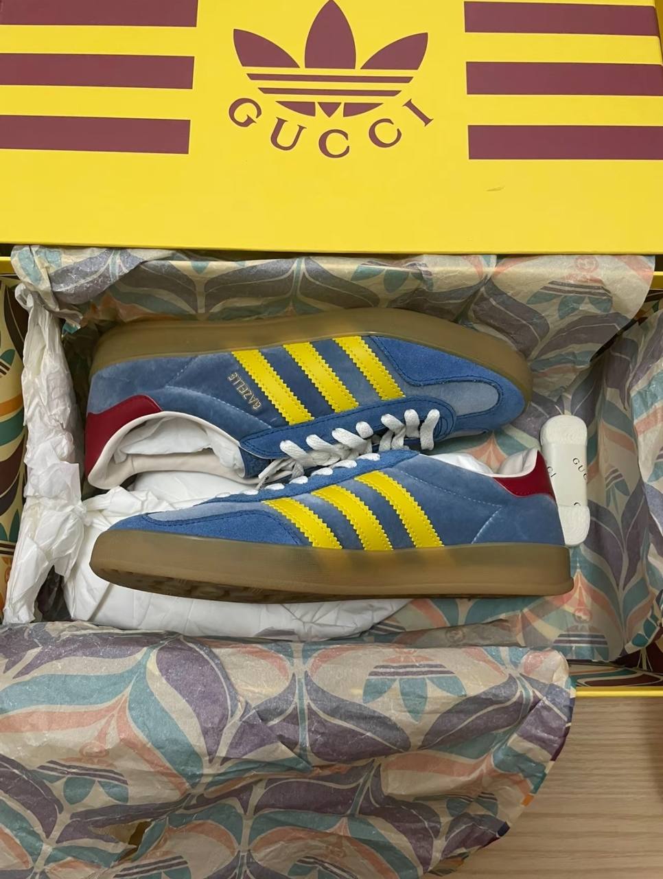 Модель Gucci x adidas Gazelle Light Blue Suede переосмысливает винтажную модель, добавляя ей привлекательную палитру. Изготовленный в Италии низкий силуэт имеет верх из голубого бархата с тональной замшей на накладке для глазков и носочной части. Фирменные полосы выполнены из желтой кожи, а на язычке пятки из кожи цвета зелени красуется фирменный знак Gucci Trefoil. На боковой четвертной панели золотой фольгой выбита надпись "GAZELLE". Подошва из прочной резины выполнена из полупрозрачного каучука.- Модель: adidas Gazelle