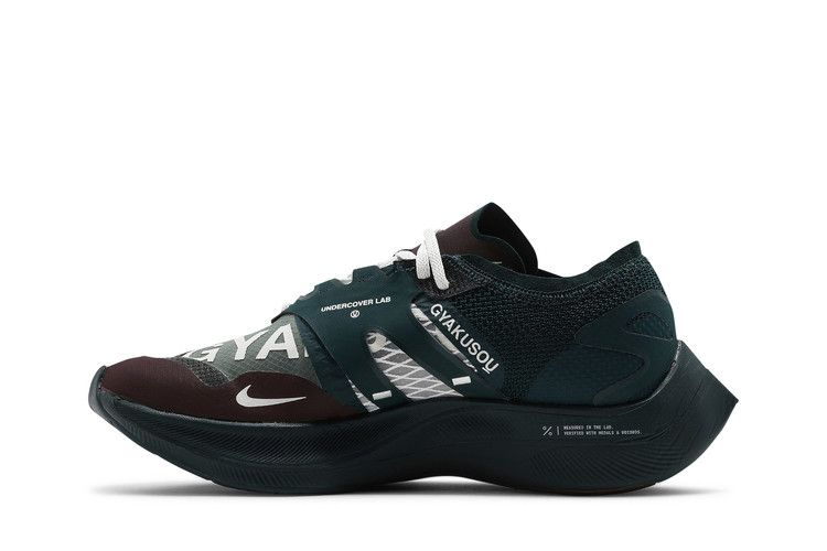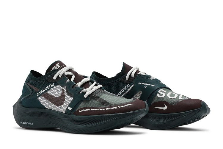 Модель Gyakusou x Nike ZoomX Vaporfly NEXT% "Midnight Spruce Burgundy", разработанная в сотрудничестве с беговым клубом Дзюна Такахаси, обновляет силуэт с уменьшенным весом, увеличенной амортизацией и характерной палитрой, состоящей из насыщенных земляных тонов. Дышащий верх из материала VaporWeave дополнен накладками без швов контрастного темно-зеленого и бордового оттенков. Надпись "Gyakusou International Running Association" нанесена на боковую поверхность передней части стопы. Чувствительная амортизация обеспечивается за счет межподошвы из пеноматериала ZoomX, дополненной пружинящей пластиной из углеродного волокна для лучшей отдачи энергии. Гибкие канавки на подошве из прочной резины обеспечивают сцепление с различными поверхностями.