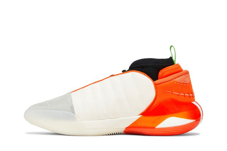 Верхняя часть adidas Harden Vol. 7 "Halloween" выполнена из смешанных материалов, а внутренняя часть ботинка из черной сетки с простроченными кожаными боковыми панелями в белоснежной отделке. Контрастный цвет придают зеленый язычок на пятке и задняя часть пятки, обтянутая оранжевой искусственной замшей. На последнем изображено жуткое лицо, а на усиленном мыске - светящаяся в темноте скелетная стопа. Кроссовки опираются на промежуточную подошву Boost в клетку с амортизацией Lightstrike, которую поддерживает подошва из светящейся в темноте резины.